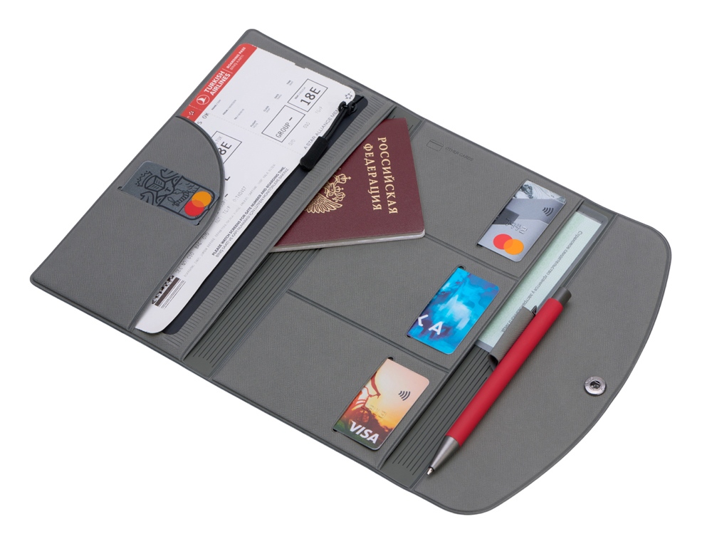 - Удобные отделения для паспорта, билетов, карт и страхового полиса.