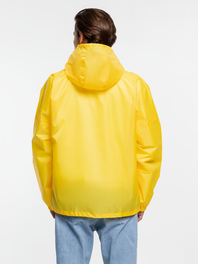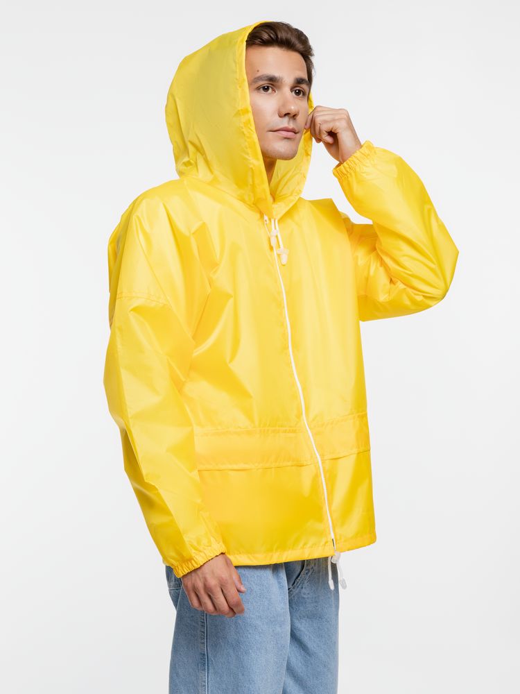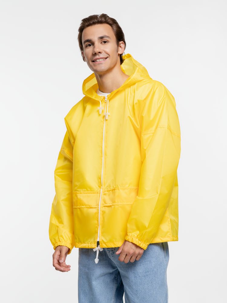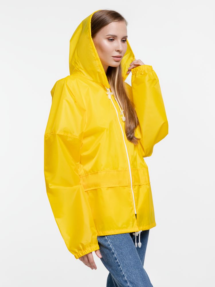 Укороченный дождевик свободного кроя из ткани таффета с влагозащитным покрытием. Складывается в мешочек — удобно брать с собой.- Два накладных кармана надежно закрыты клапанами и защищены от дождя