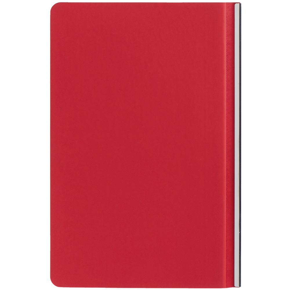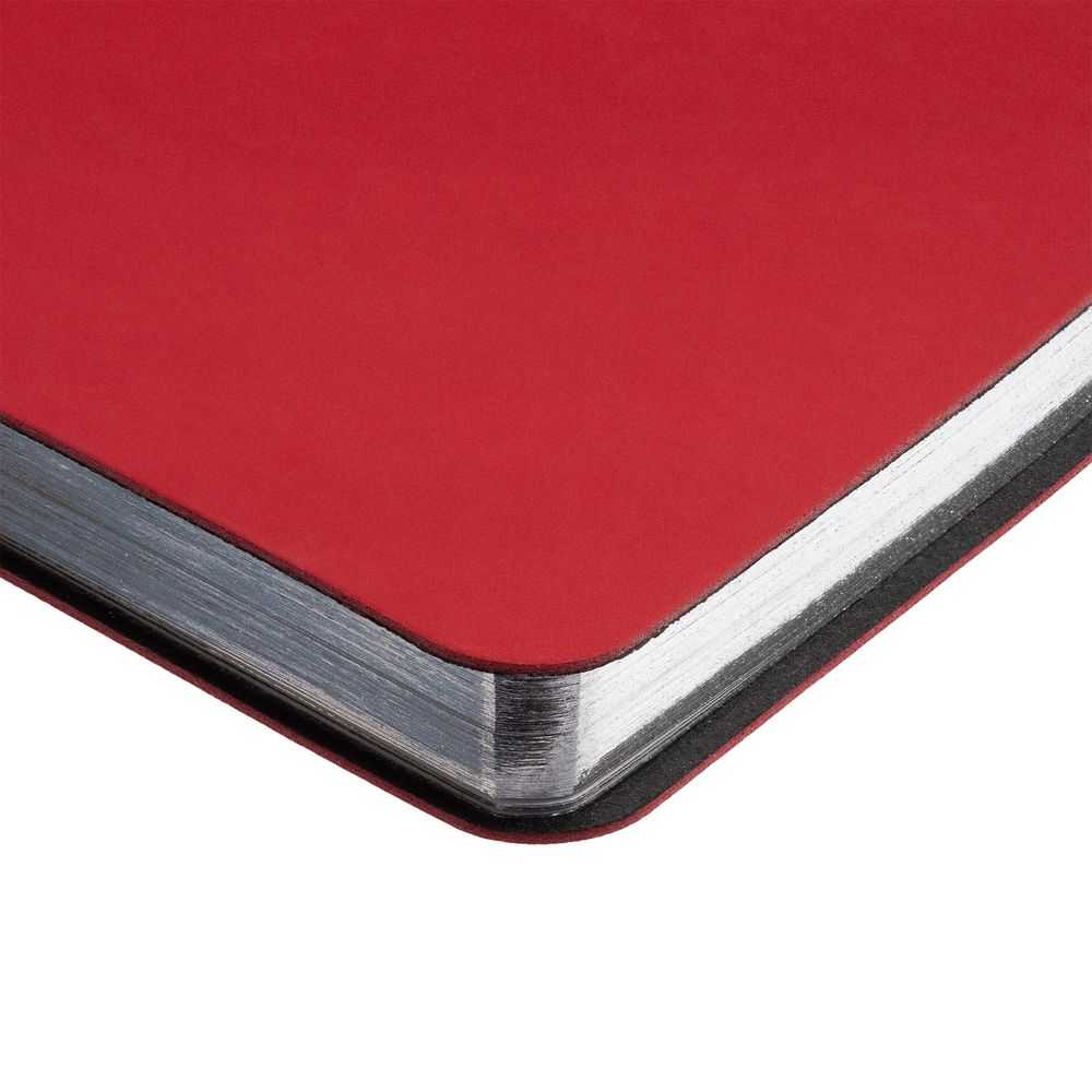 Ежедневник с гибкой обложкой и металлическим корешком, выполнен из материала Soft Touch Ultra, красный РР, дополнен серебристым обрезом блока и ляссе.