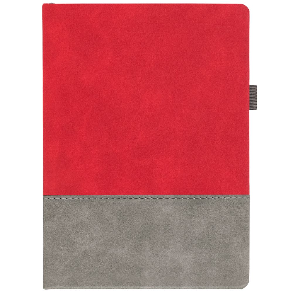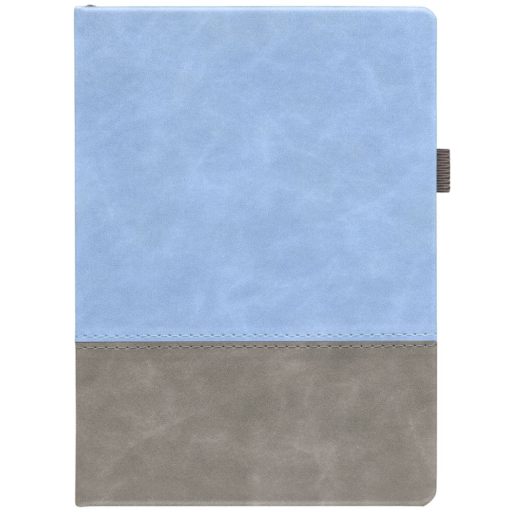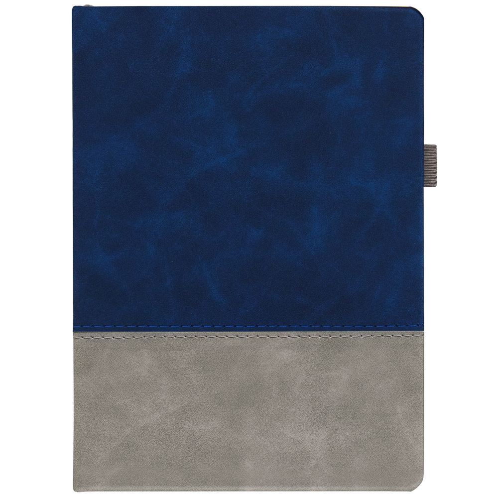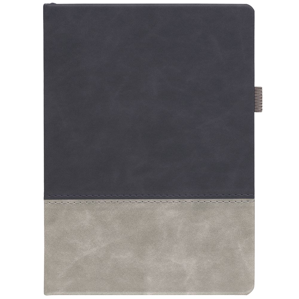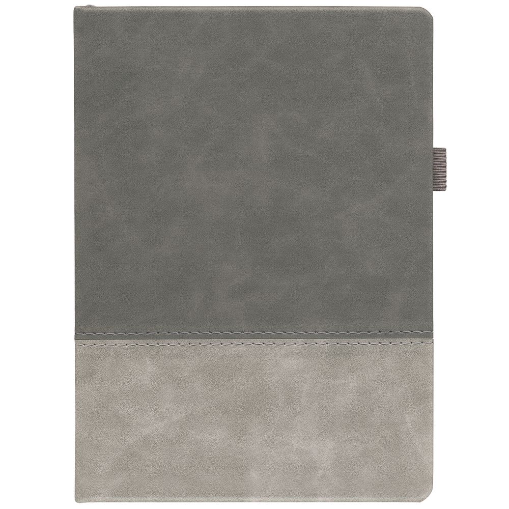 Ежедневник с твердой обложкой, без поролона, со сшивкой материалов Nubuck Touch, серый СС, и Nubuck Touch зеленый FF, дополнен двойным ляссе и петлей-резинкой для ручки.