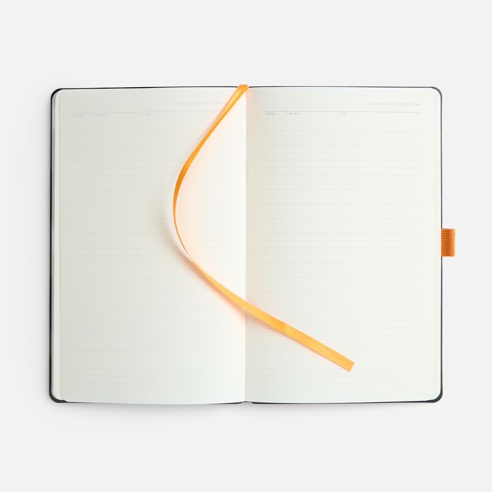 Ежедневник с гибкой обложкой, выполнен из материала Espresso, дополнен цветными ляссе и петлей-резинкой для ручки.