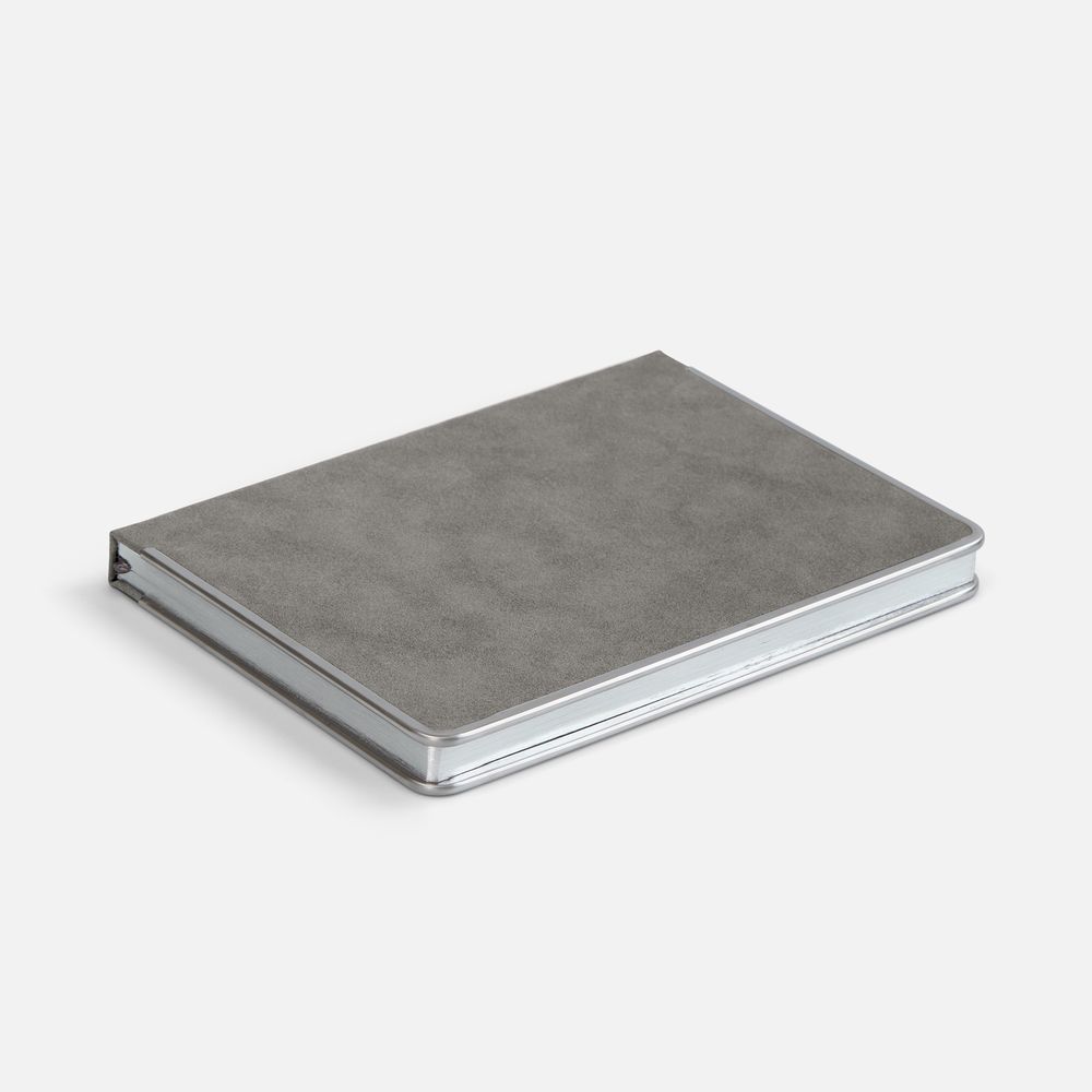 Ежедневник с твердой обложкой и серебристым обрезом блока. Выполнен из материала Nubuck, серый СС, дополнен серым ляссе и металлическими рамками с двух сторон обложки.