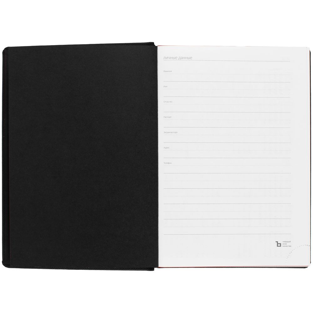 Твердая обложка выполнена из материалов Nice Touch, черный АА, и Canyon, красный РР. Ежедневник дополнен капталом, резинкой для ручки и ляссе черного цвета.Блок 922, с информационным блоком: