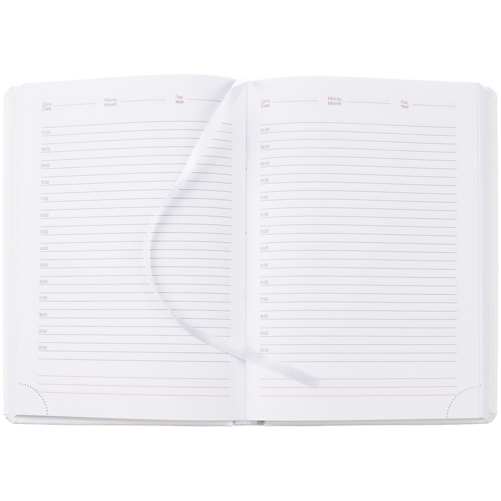 Ежедневник с твердой обложкой, выполнен из материала Waltz, белый ВВ, дополнен ляссе в цвет материала.