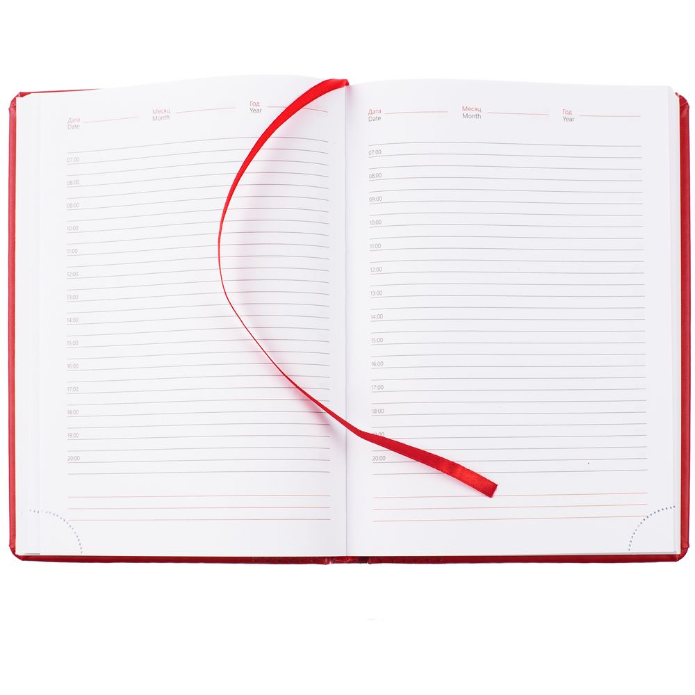Ежедневник с твердой обложкой, выполнен из материала Waltz, красный PP, дополнен ляссе в цвет материала.