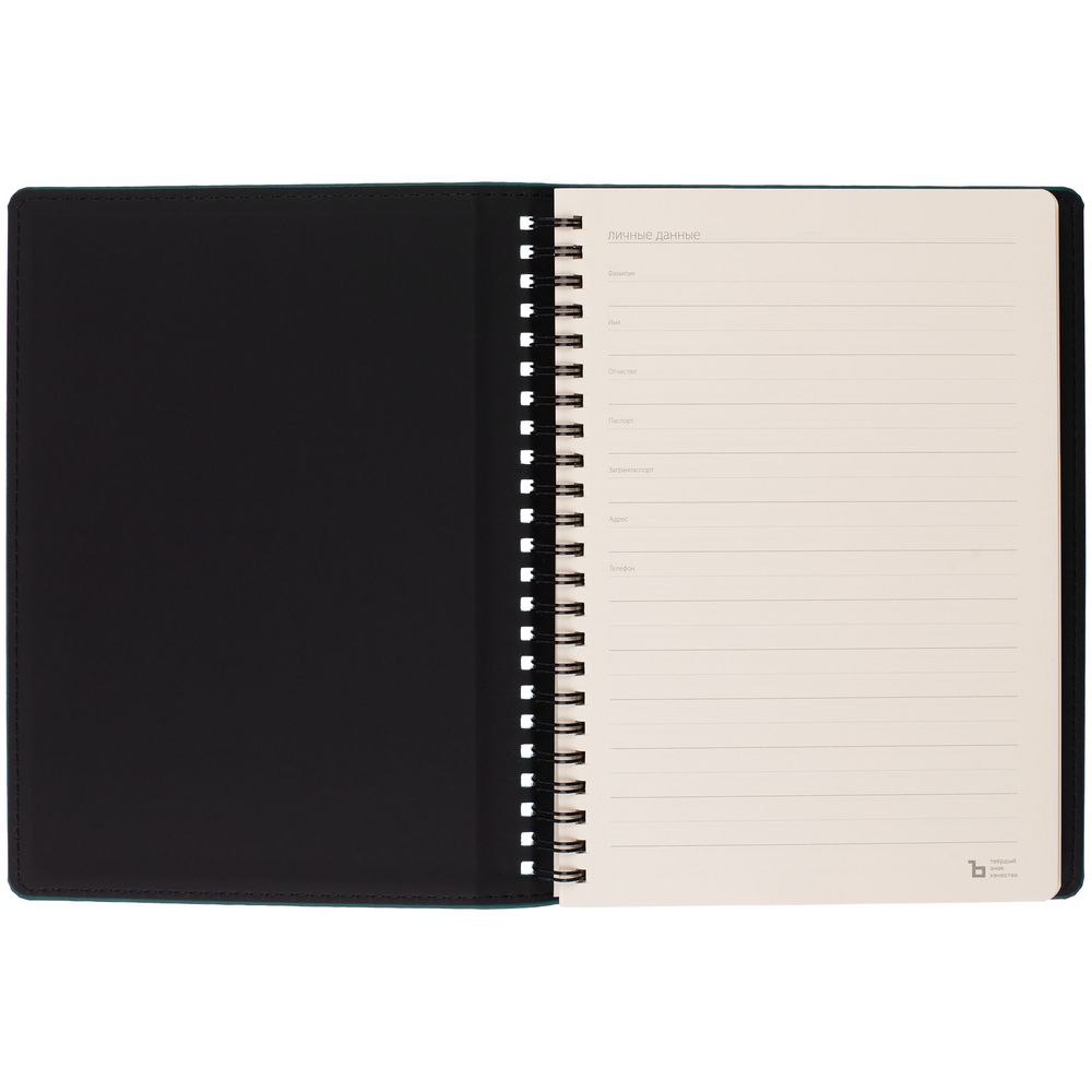 Ежедневник с блоком на пружине в твердой обложке, выполнен из материалов Nubuk Touch, темно-зеленый VV и Soft Touch, черный AA.