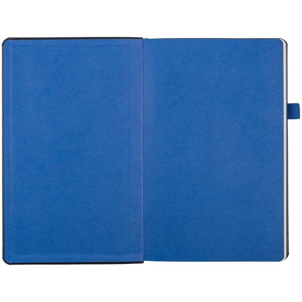 Ежедневник с твердой обложкой, выполнен из материала Waltz, черный АА, дополнен синей резинкой и ляссе.