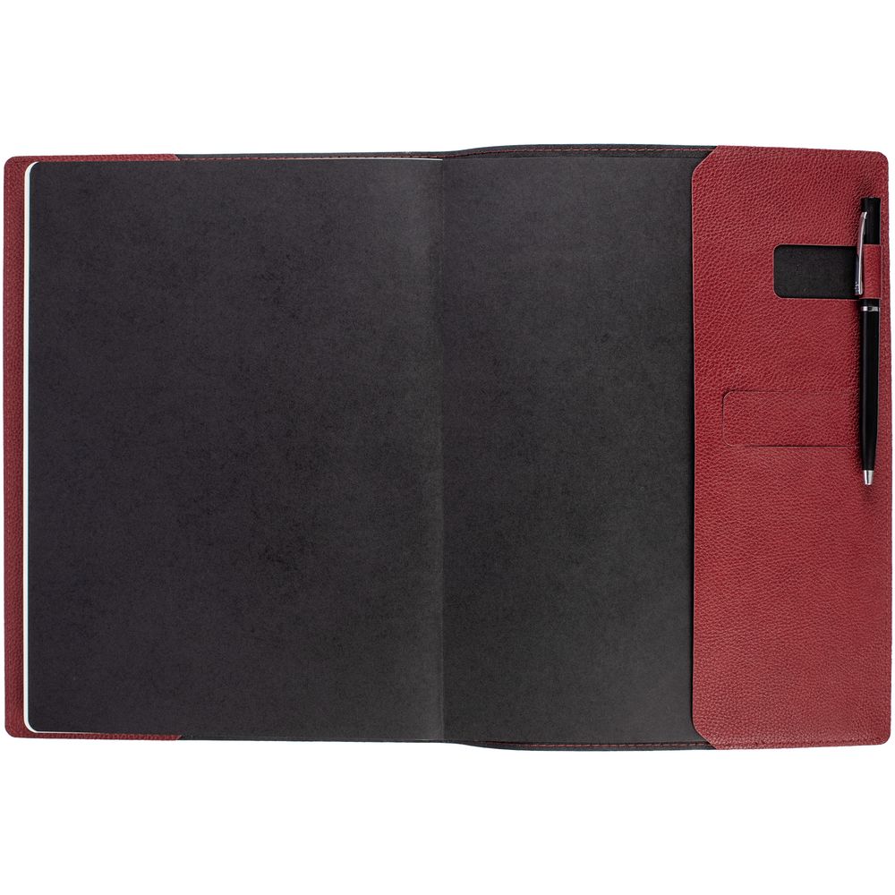 Ежедневник в суперобложке выполнен из материала La Fite, красный РР, дополнен ляссе и капталом черного цвета.