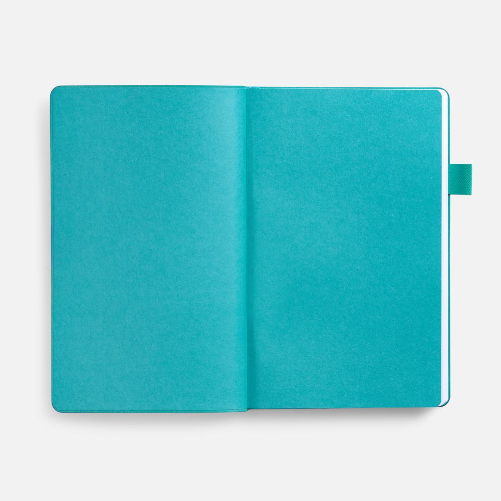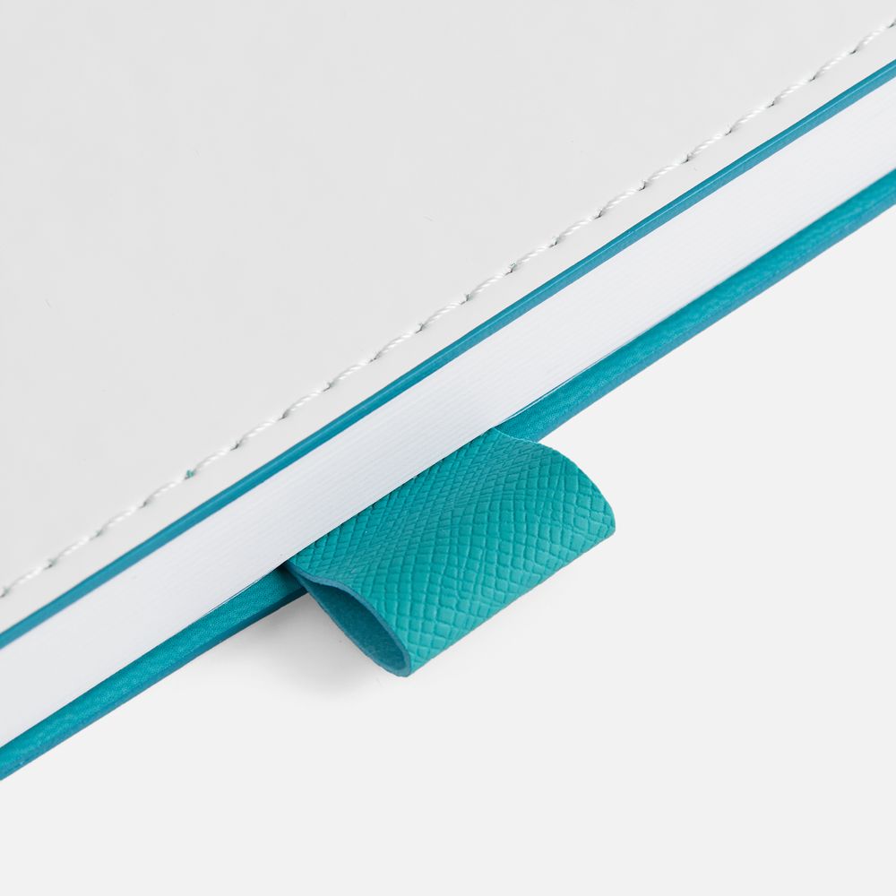 Гибкая обложка, материал обложки — Soft Touch, белый BB и Latte, цвета морской волны II; материал петли для ручки — Nice Touch, цвета морской волны II. Срез обложки окрашен в цвет морской волны.