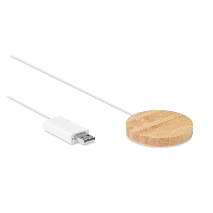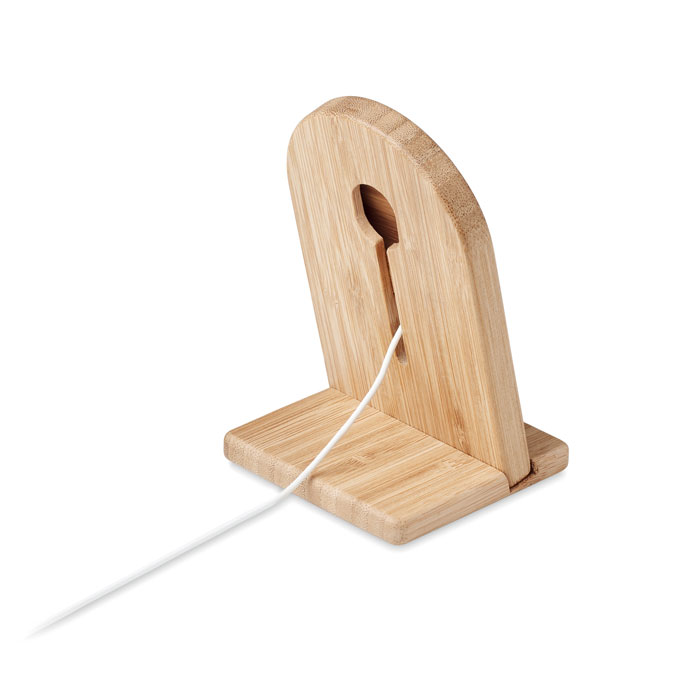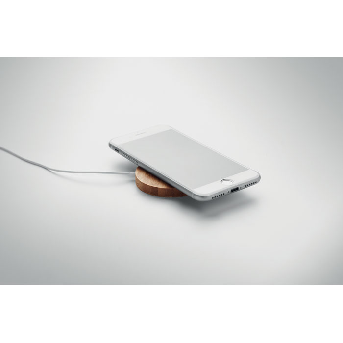 Магнитная б/п зарядка из бамбука с подставкой. Выход: DC 9V/1.1A (10W). Совместимо с iPhone® 12 и новее. Включает металлическое кольцо для зарядки дополнительных устройств, поддерживающих функции б/п зарядки. -