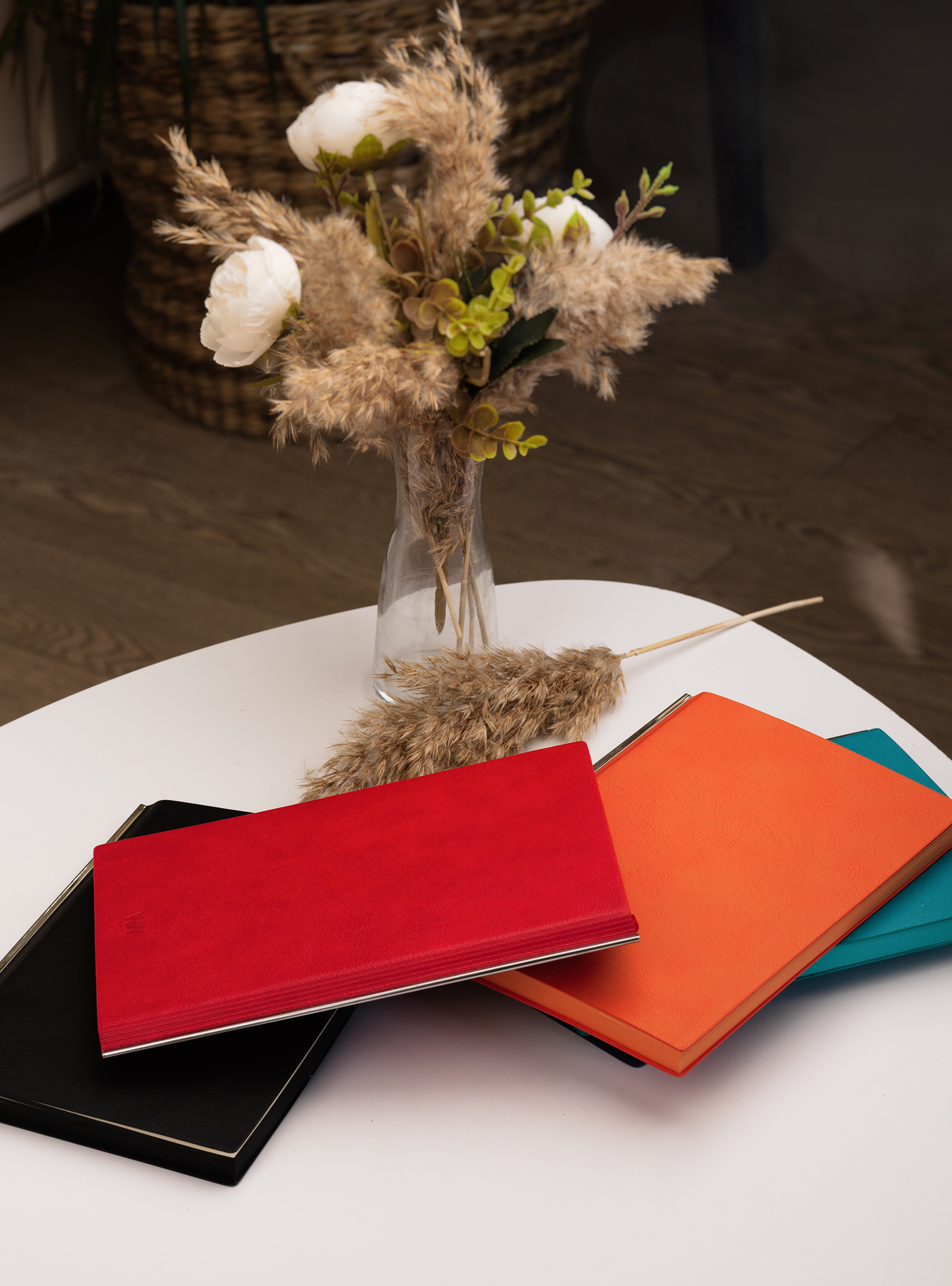 Притягивает внимание, офисные принадлежности и желание что-нибудь срочно записать. Минималистичный в оформлении ежедневник «Аскона» представлен в ярких насыщенных цветах с цветным срезом. Гибкая обложка имеет фактуру натуральной кожи, её дополняет металлическая планка корешка. Блок из плотной тонированной бумаги в 256 страниц удобно использовать с чёрной лентой-ляссе в цвет среза ежедневника.