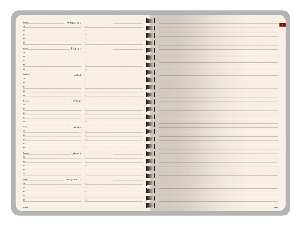 Недатированный блок состоит из 128 страниц, укреплённых на пластиковом полускрытом гребне. На 21 странице размещена справочная информация на русском языке. День недели указан на русском и английском языках.