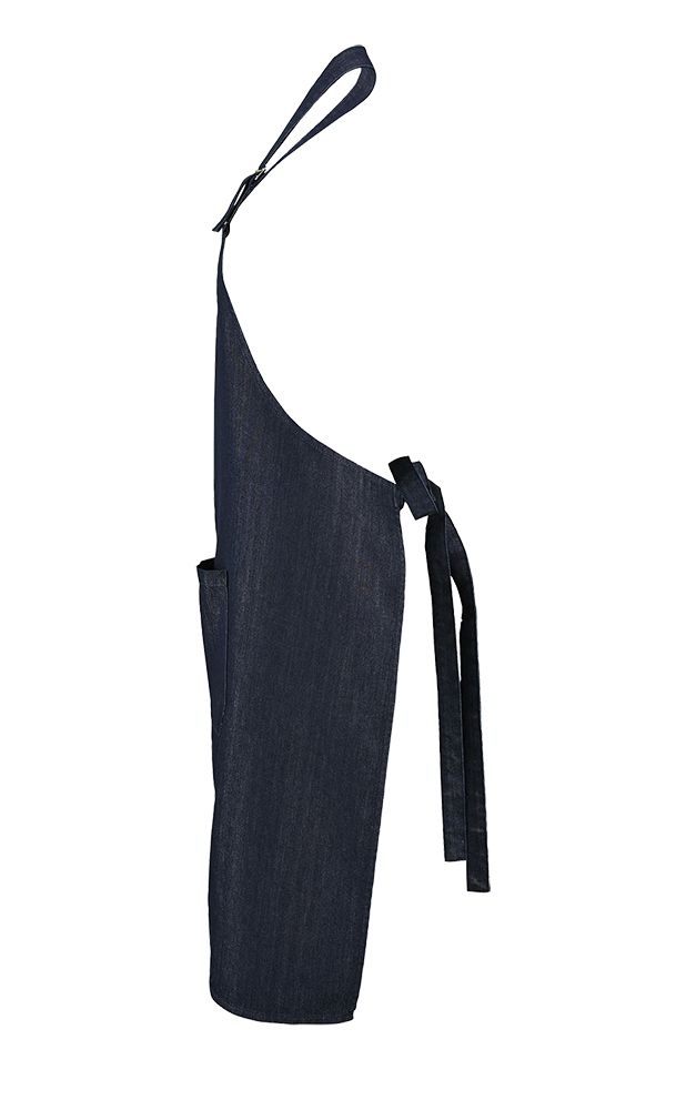 Стильный фартук из сырого денима с большими карманами спереди и регулируемой лямкой. -