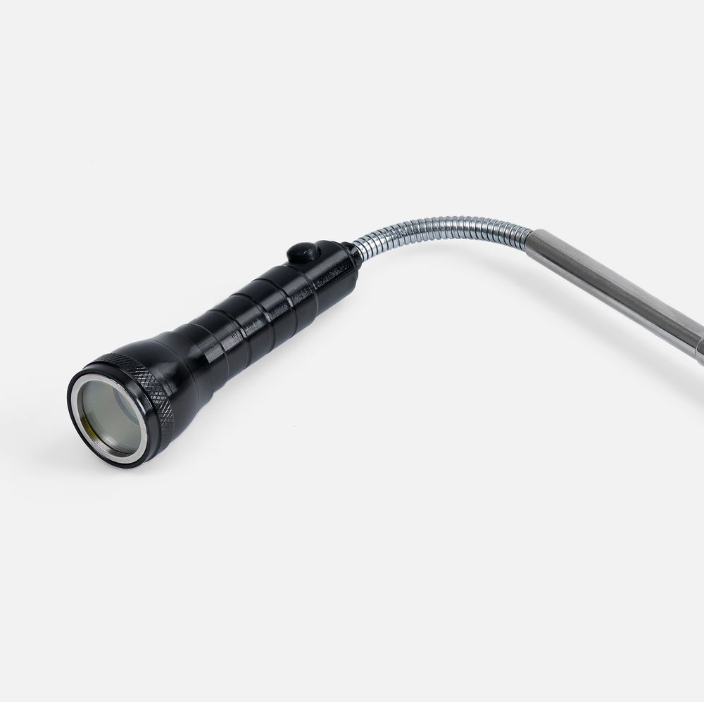 Компактный фонарик Flexion — идеальное средство для освещения труднодоступных мест. Регулируемая длина и гибкое крепление лампочки позволяют направленно и точечно подсвечивать нужные зоны в самых сложных местах, например, под капотом или за мебелью. С помощью магнита на корпусе можно закрепить фонарь на металлической поверхности, освободив руки, —особенно удобно при ремонте, строительстве или работе в гараже. Магнит на излучателе поможет с легкостью достать упавшие в узкие щели металлические предметы.- Телескопическая ручка;