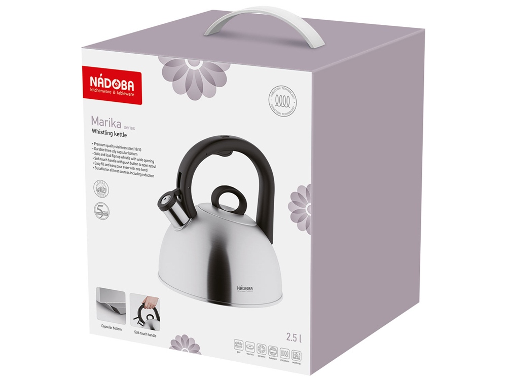 - Чайники серии Marika изготовлены из высококачественной нержавеющей стали 18/10. В серию NADOBA Marika входит чайник объёмом 2,5 л.