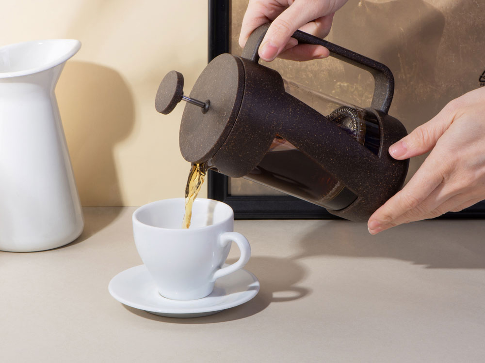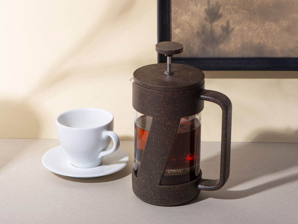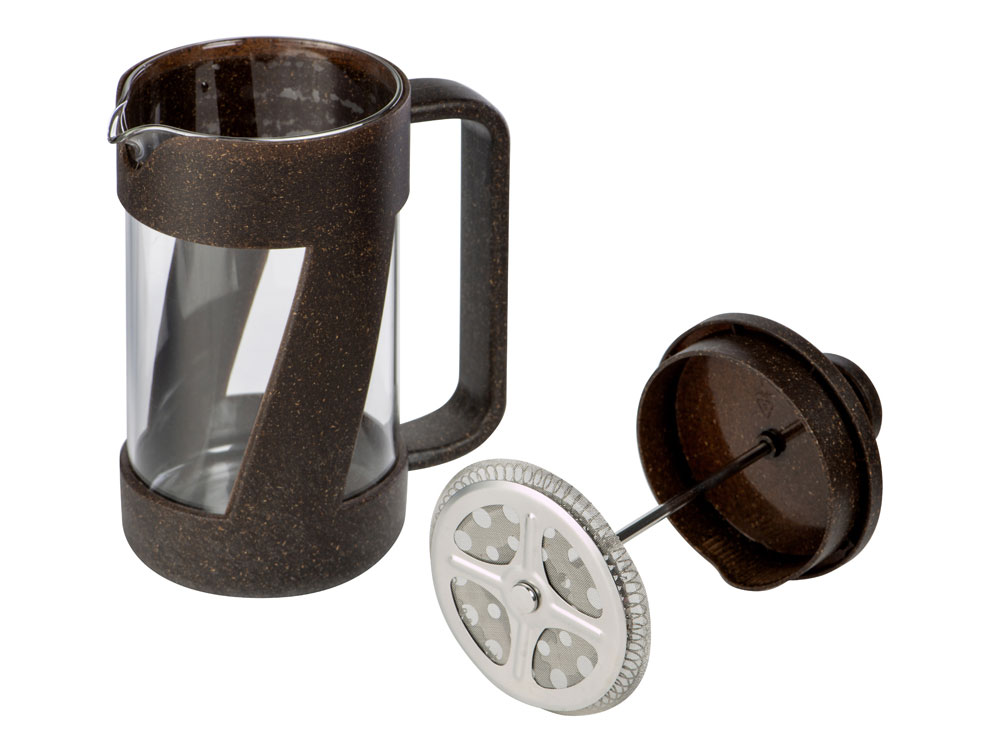 емкость - боросиликатное стекло, фильтр - нержавеющая сталь 304 марки, корпус - 85% ПП пластик, 9% древесные волокна, 6% кофейный жмых