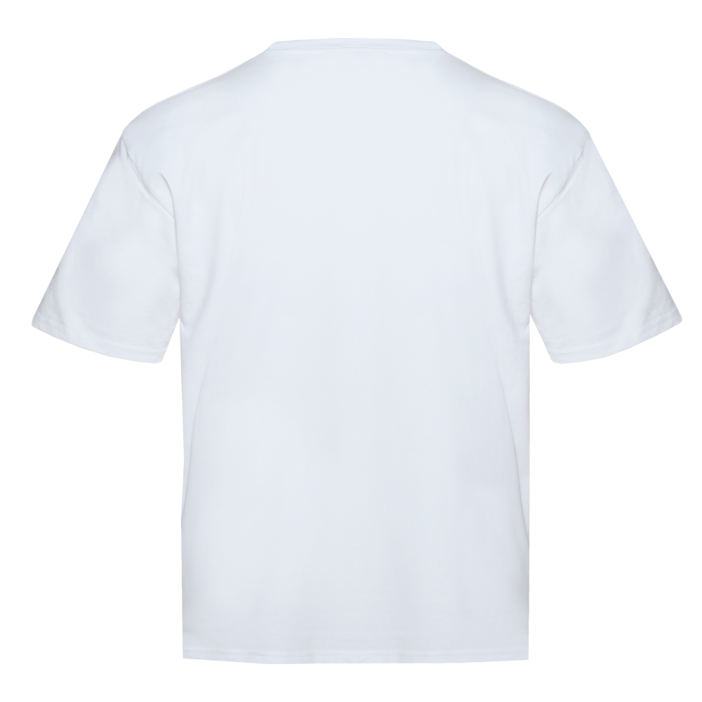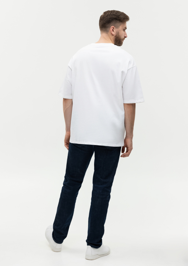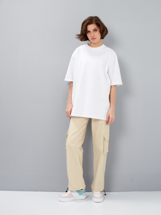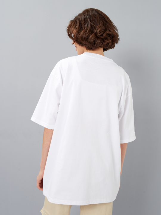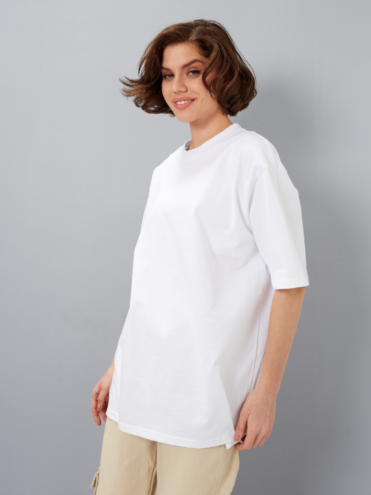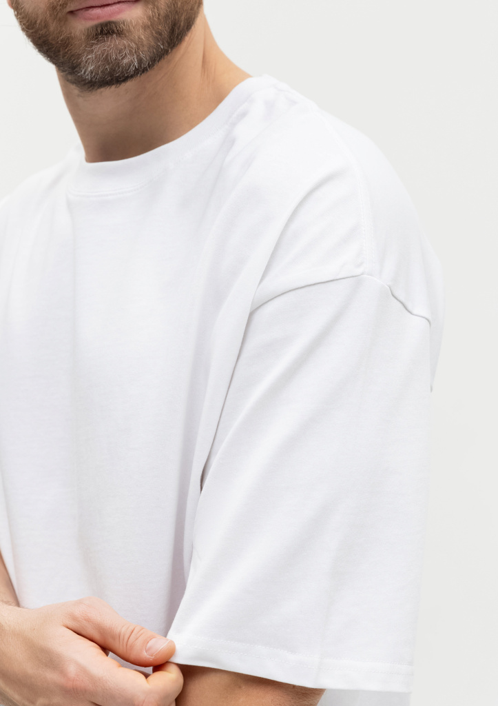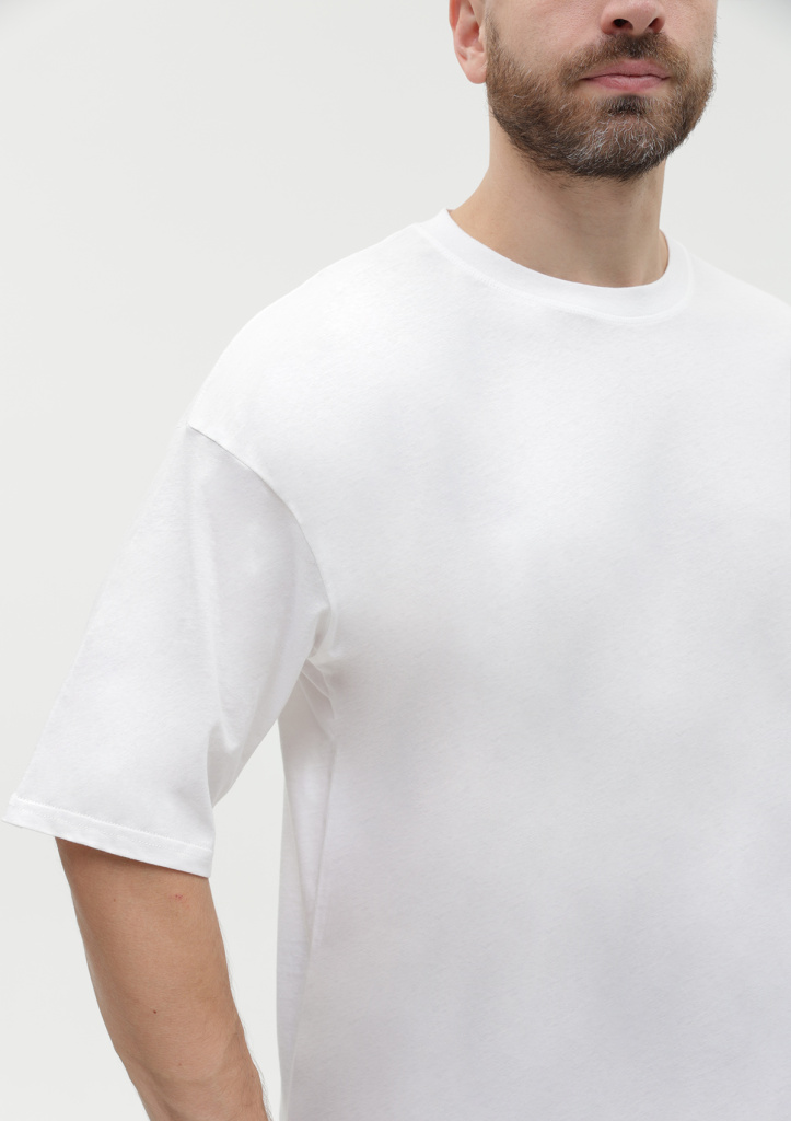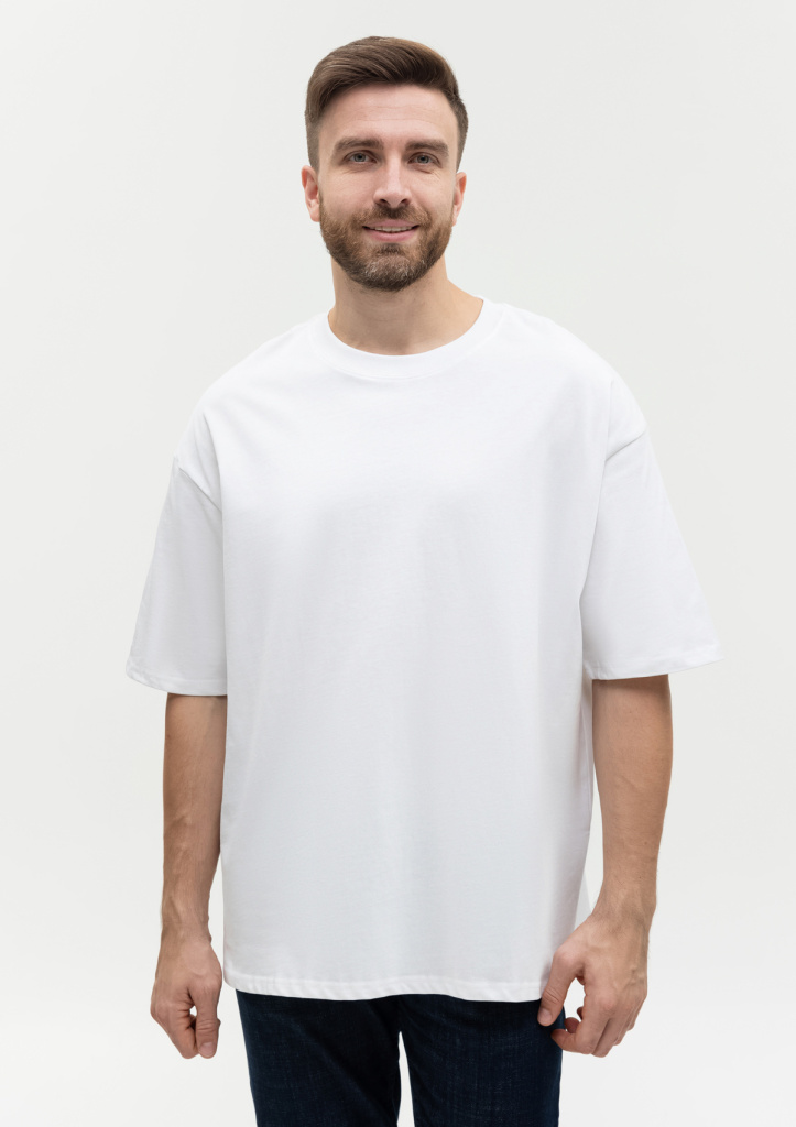 Универсальная футболка силуэта-оверсайз с округлым воротом и спущенной линией плеча.
