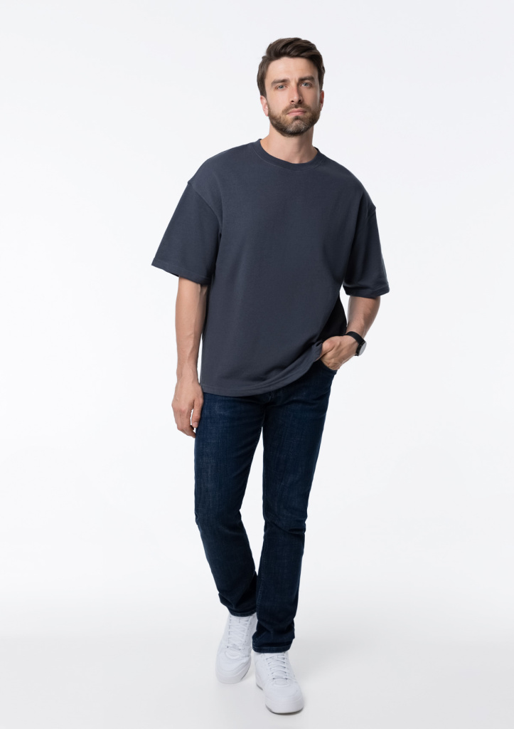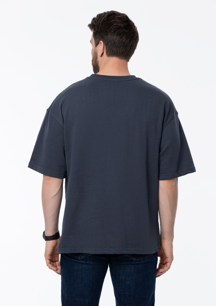 Футболка свободного кроя с округлым воротом и спущенной линией плеча. Шов горловины спинки усилен киперной лентой в тон основному цвету. Универсальная модель идеально впишется как в мужской, так и в женский гардероб.