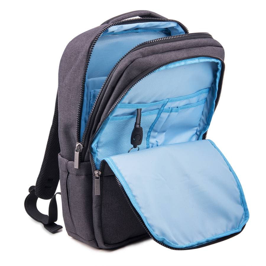 Стильный и функциональный рюкзак из коллекции COREПодходит для ноутбука до 15,6 дюймовГолубой подклад из нейлона, цвет близкий к PANTONE 292 CЦвет основного материала близкий к PANTONE 7540 CОсновное отделение с плотной эргономичной спинкой, дополнительным разделителем, с карманом с RFID защитой для размещения самых ценных предметов и встроенным USB Внешнее отделение с мелкими кармашками для мелочей и держателем для ключей со съёмным колечком и светоотражающей детальюНебольшой внешний карман на лицевой стороне в нижней части на молнии со стильнымпластиково-металическим пуллеромБоковые карманы для бутылки или зонта с эластичной регулировкой шириныМягкие эргономичные лямки со светоотражающими элементами, креплением для очков и регулированием по длинеДеталь на спинке для крепления на ручку чемоданаОсновные отделения с двухзамковой тракторной молниейи матовыми металлическими пуллерами Back FlyФирменная декоративная прострочкаПыльник для хранения в комплекте, индивидуальная упаковка в прозрачную плёнку -