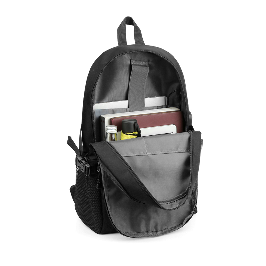Полуспортивный и многофункциональный городской рюкзак METROPOL. Его особенности - в этом рюкзаке элементы спортивного стиля и высококачественного нейлона сочетаются с высокой функциональностью. Два отделенияя закрываются на молнии. В заднем уплотненный карман для ноутбука 15,6 дюймов с клапаном-резинкой на велькро и карман-органайзер для мелких аксессуаров.. На передней стенке вертикальный карман на молнии. Сбоку USB-разъем с проводом для подключения внешнего аккумулятора, который при необходимости можно спрятать под небольшой молнией внутри и два объёмных кармана с вентилируемой сеткой и регулируемыми тесьмами-стяжками на защёлках-фастексах которые существенно расширяют функционал и вместимость рюкзака. 3D-сетка на подкладке плечевых ремней предотвращает скольжение и обеспечивает дополнительную вентиляцию и комфорт при контакте с кожей и одеждой. Уплотнённые плечевые ремни регулируются по длине и имеют дополнительные петли из тесьмы для крепления аксессуаров и гаджетов. Размер: 46*33*16 см Материал: Нейлон Рекомендуемая максимальная нагрузка: не более 10 кг. Вместимость: 22 л. Вес: 0.61 кг Возможно добавление пуллеров (арт. 4093) в количестве 5 шт в семи вариантах цвета и нанесение на них УФ печати Возможна кастомизация с помощью ремувки (арт. 4094, 4097) в восьми вариантах цвета и нанесение на неё термопечати- Виды нанесений: Термотрансфер DTF, Шелкотрансфер