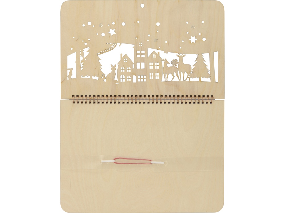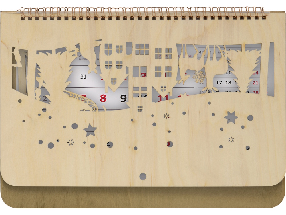 Настенный перекидной календарь имеет необычную обложку, в роли которой выступают фанерные крышки. Нижняя крышка сплошная, верхняя — резная, ажурная, с вырезанным новогодним пейзажем и большим полем под нанесение логотипа или надписи, которая органично впишется в облик календаря.