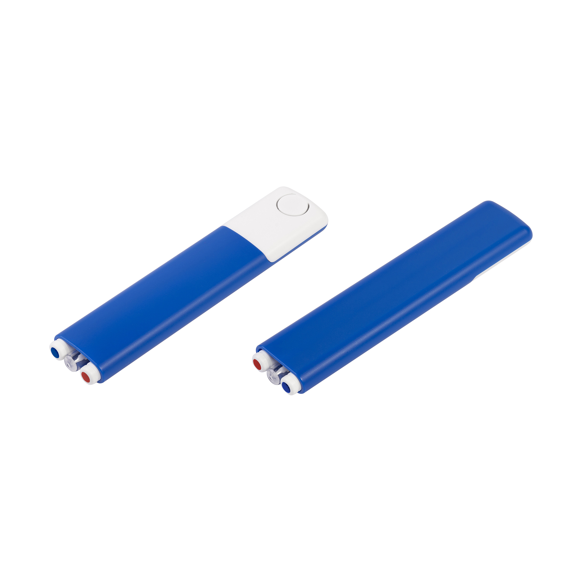 Две ручки. Размер 12 х d 0,8 см. Одна с классической синей пастой, другая с яркой красной, цветные метки сверху указывают на цвет чернил. Корпус ручки разборный, стержень легко заменить.