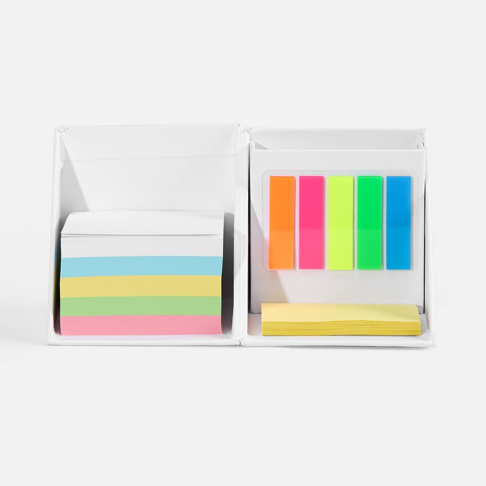 9х9х9 см; блок бумаги 7,5х7,5 см; блок листов с клейкой лентой 7,5х5 см; пластиковые закладки 4,5х1,2 см