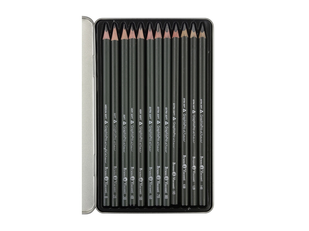 Набор ультрамягких чернографитовых карандашей со степенью твердости В-14В. Карандаши предназначены для нанесения густых теней и великолепно растушевываются. Их корпус произведен из термообработанной липы, вязкость и плотность которой позволяет надёжно удерживать грифель и сохранять качество заточки на высоком уровне.
