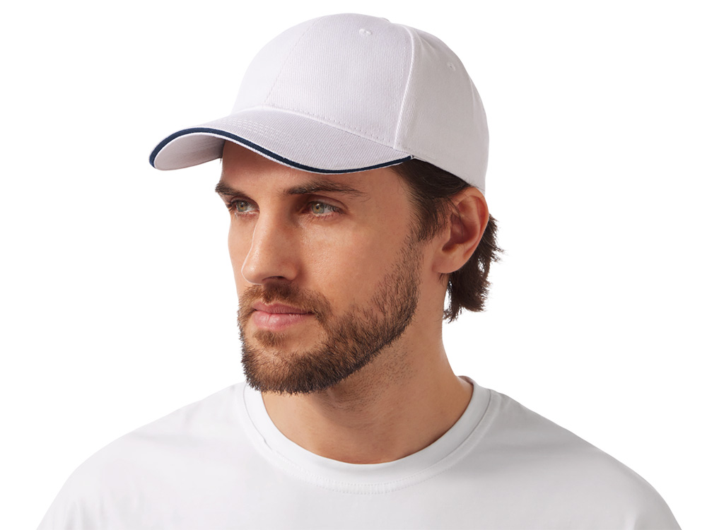 Стильный контрастный кант по козырьку и заднему хлястику добавляет изделию выразительности и делает бейсболку заметным элементом образа.