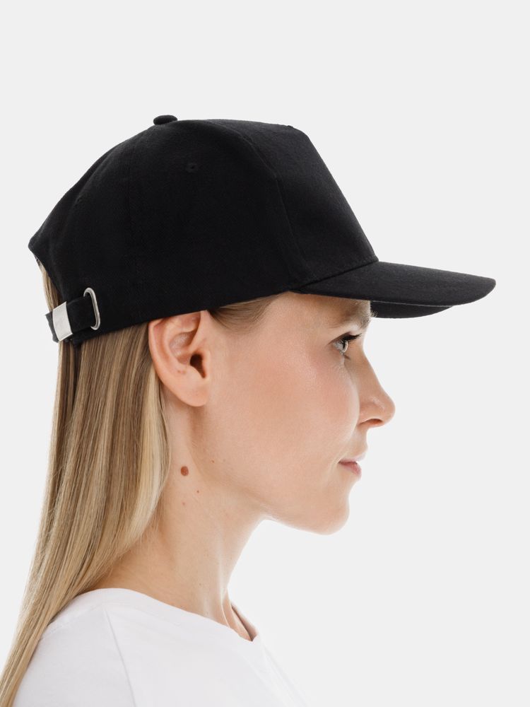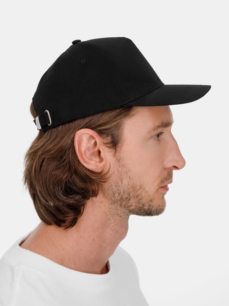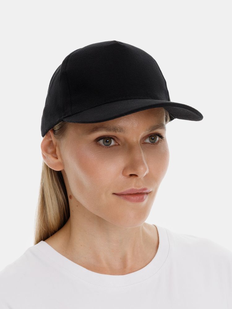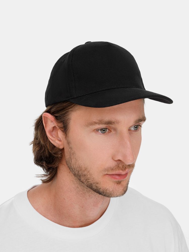 Модель бейсболки с 5-ю клиньями без лобового шва из плотного чесаного хлопка.