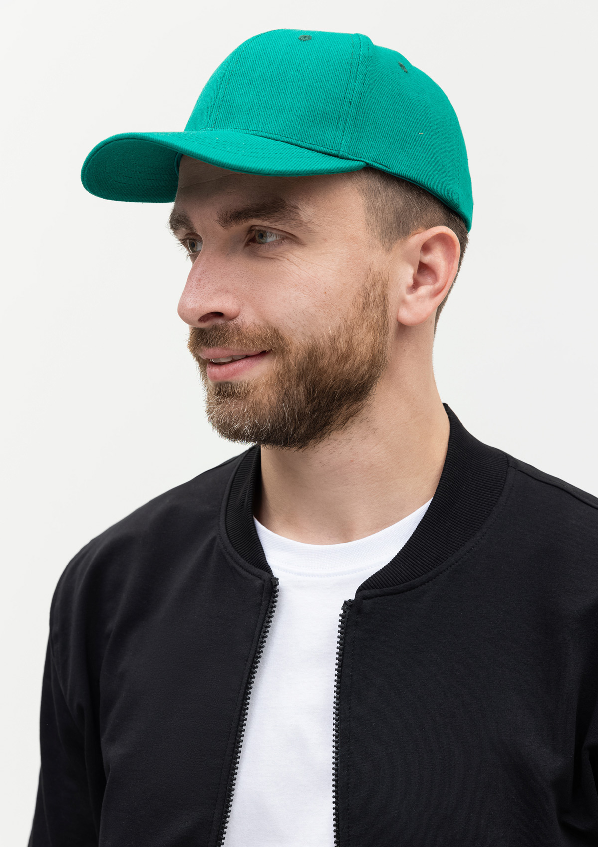 Бейсболка-шестиклинка с изогнутым жестким козырьком, прилегание регулируется ремешком с металлической застежкой.