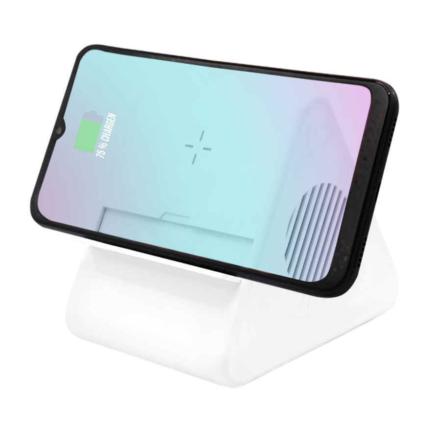 Это стильное устройство в белом цвете станет отличным дополнением к вашему рабочему месту или вечеринке. Колонка не только воспроизводит любимые треки, но и заряжает ваши гаджеты с мощностью беспроводной зарядки 15W! ✅ Встроенный аккумулятор 400 mAh ✅ Мощность динамика 3W ✅ Возможность подключения по сети для зарядки УФ-печать и тампопечать обеспечат уникальный дизайн с вашим логотипом Область зарядки смартфона поддерживает все Android/Ios устройства с функцией беспроводной зарядки. Для работы беспроводной зарядки необходимо подключать устройство к сети через адаптер.- Виды нанесений: УФ-печать А2, Тампопечать большая