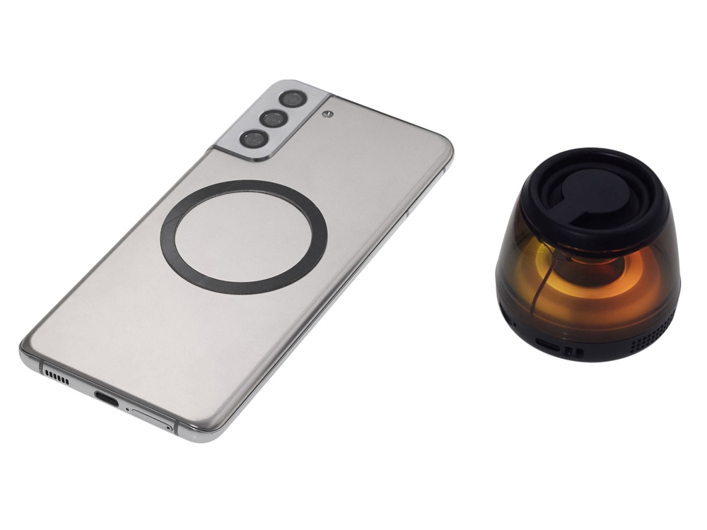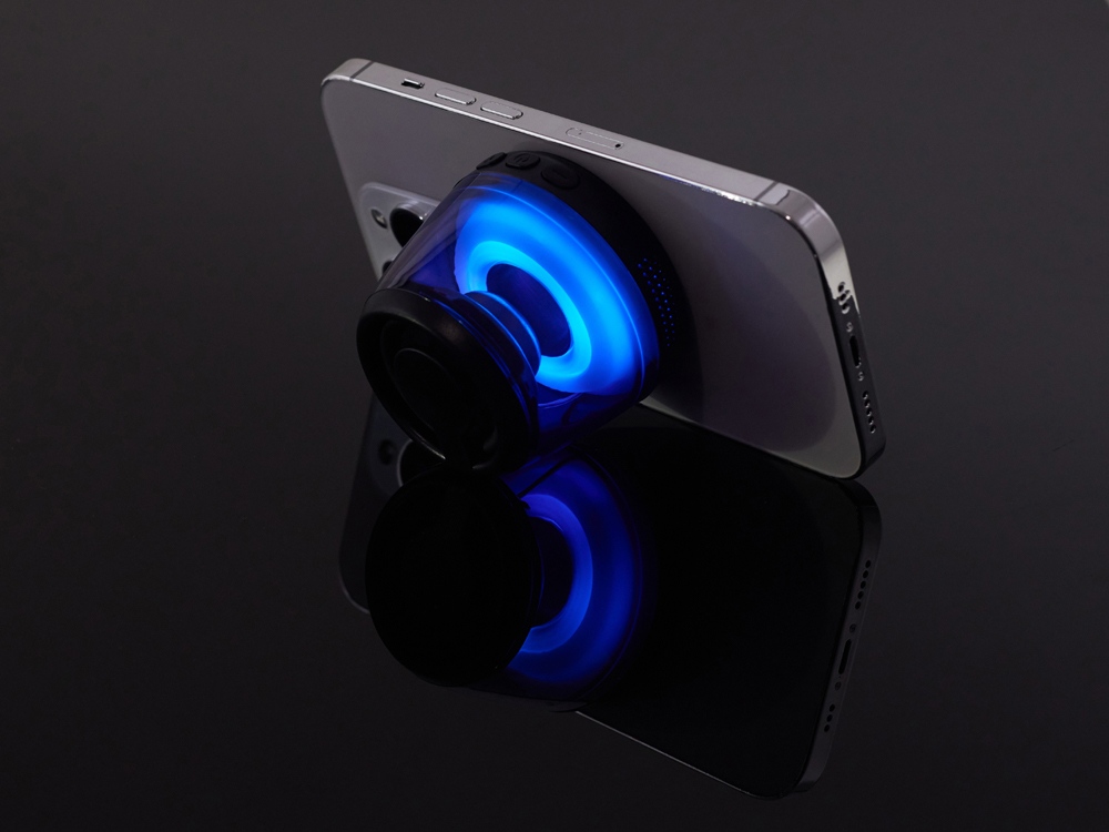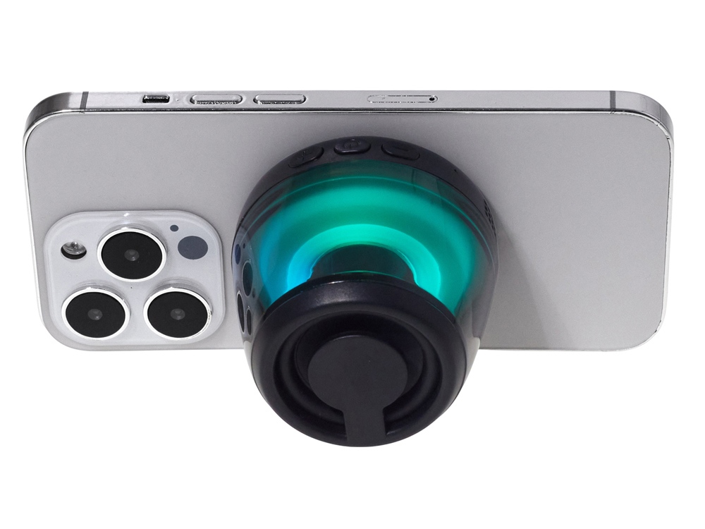 Современная магнитная Bluetooth-колонка колонка крепится к любому смартфону (iPhone -нативно, к другим -благодаря кольцу из комплекта). Это позволяет не только освободить руки, но и добавляет удобную подставку телефону. Динамик 40мм и мощностью 5 Вт обеспечивает сильное и насыщенное звучание даже в компактном корпусе. RGB подсветка имеет несколько режимов (переключение по трехразовому нажатию кнопки ВКЛ.). В комплекте кроме кольца – зарядный кабель USB-C и ремешок-ланъярд. Может принимать звонки и имеет разъем для micro SD карт памяти.
