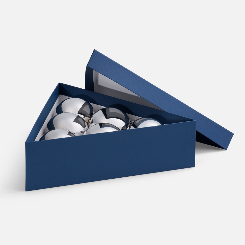 Трехгранная коробка Trigon прекрасно подходит для упаковки набора из 6 елочных шаров диаметром 10 см, а также других подарков нестандартной формы.