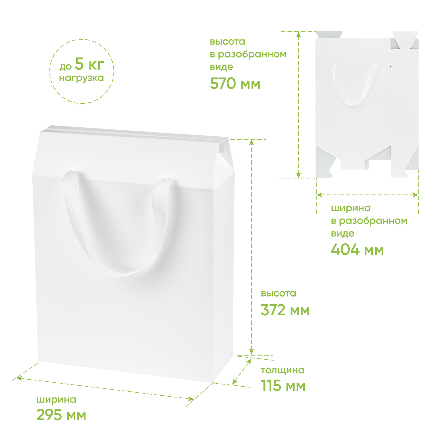 Универсальный пакет – коробка выполнен в белом цвете с ручками из рапсовой ленты. Вместительный и изящный, он станет хорошим решением упаковки подарка.