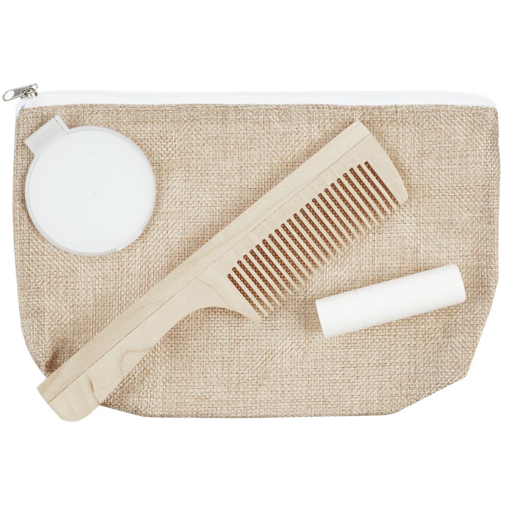 помада: 1,8x1,8x6,7 см; расческа: 19,3х4,4х0,5 см; зеркало: 6x6x0,5 см; косметичка: 23х13х4 см