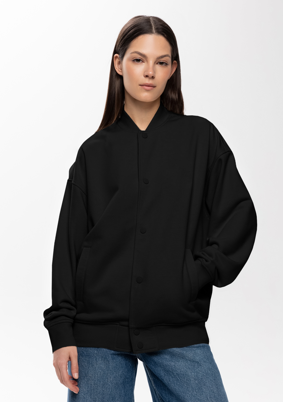 Размер женского бомбера: S/46. Параметры модели: рост 173 см.; обхват груди 80 см.; обхват талии 58 см.; обхват бедер 89 см.