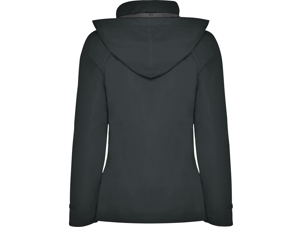 Парка прилегающего силуэта с высоким воротом застегивается на молнию в тон: