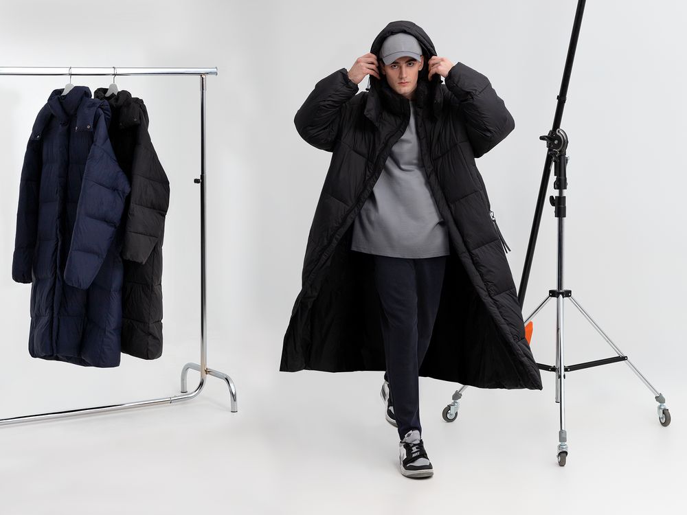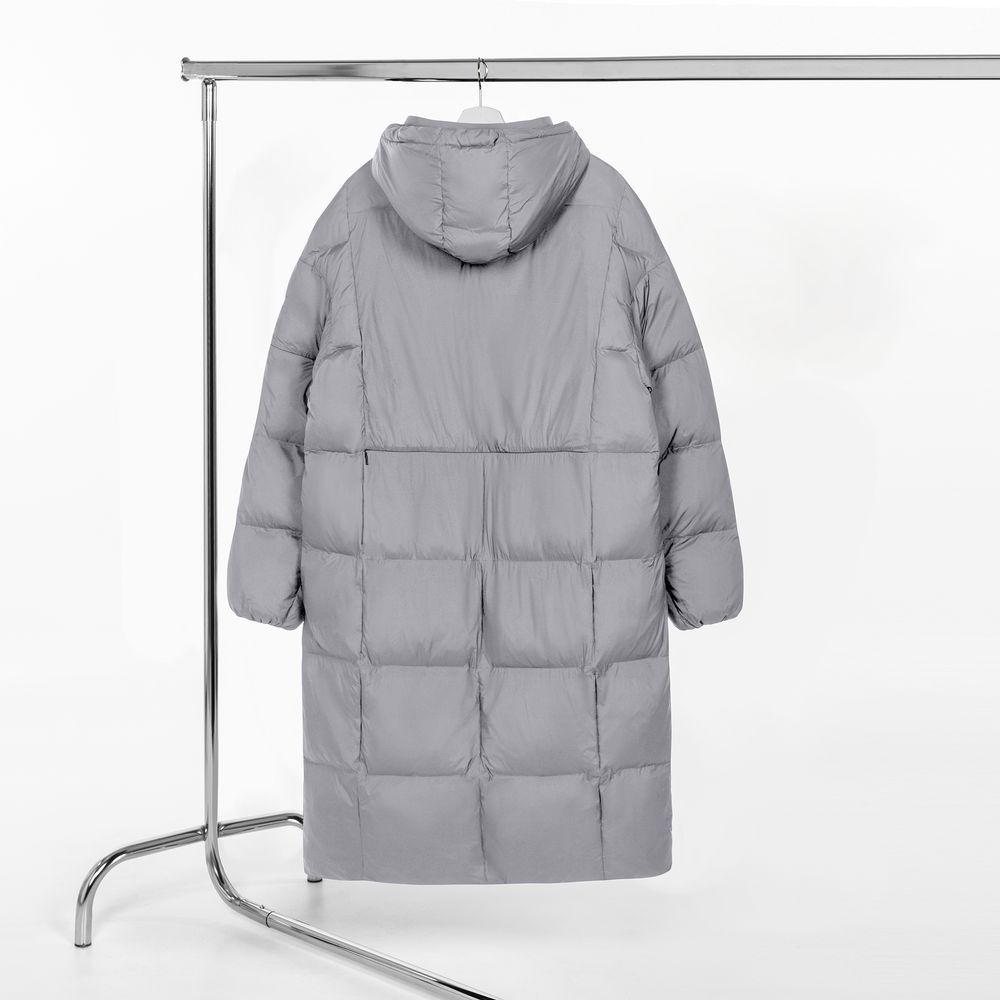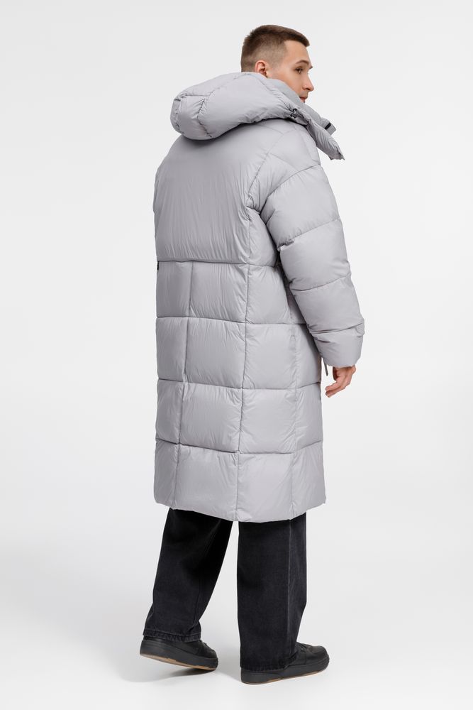 Удлиненный пуховик унисекс с капюшоном.- Воротник-стойка