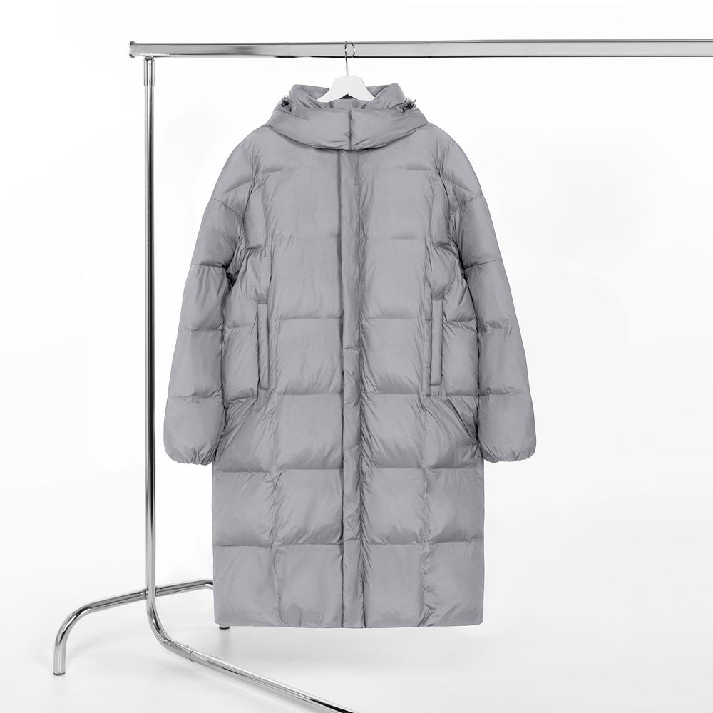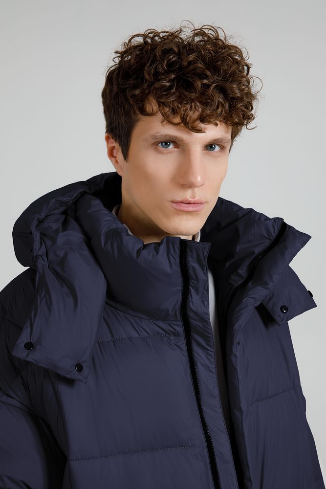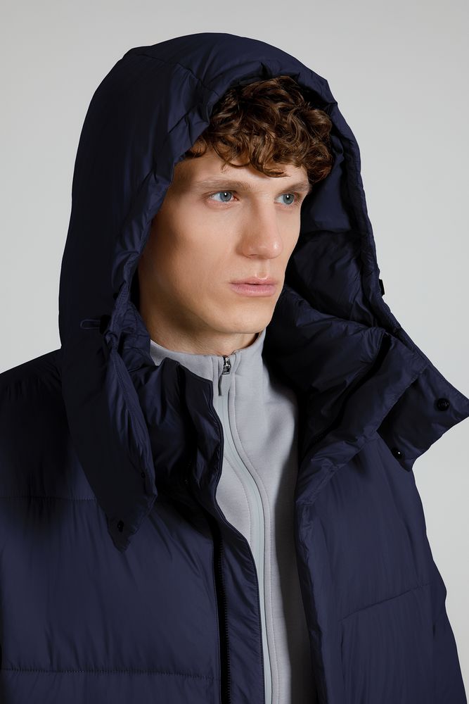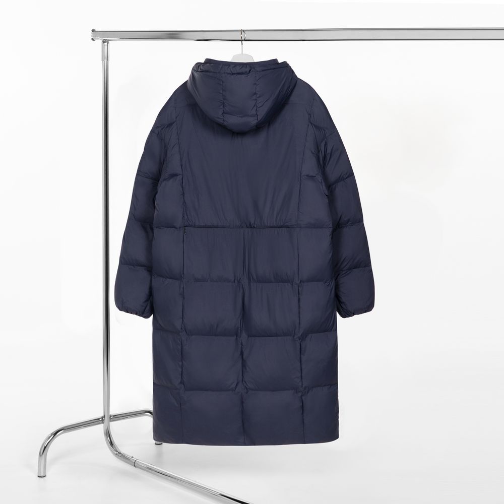 Удлиненный пуховик унисекс с капюшоном.- Воротник-стойка