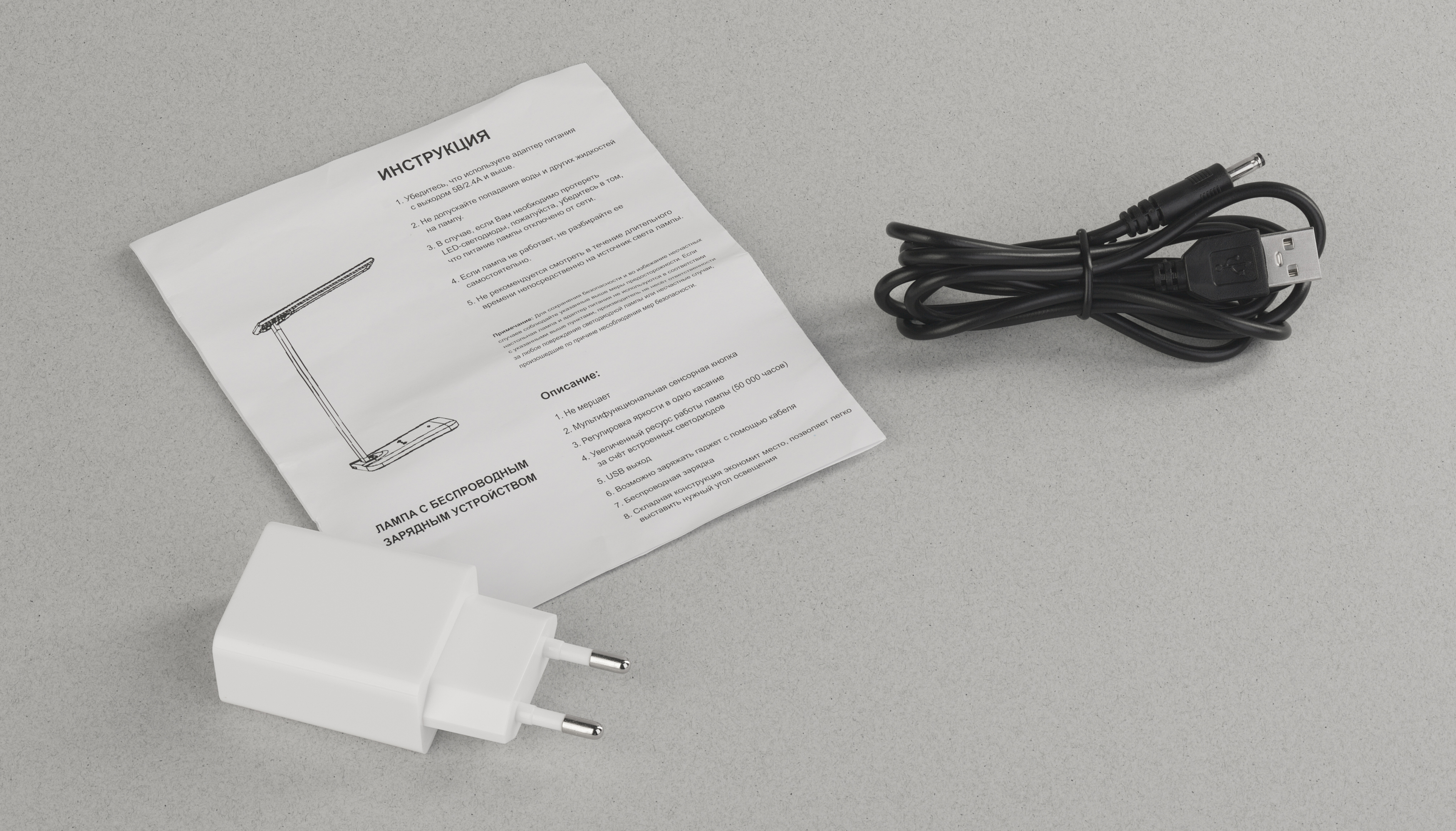 В комплекте зарядный кабель 120 см и адаптер (input 100-240V, output DC5V-2.4A).