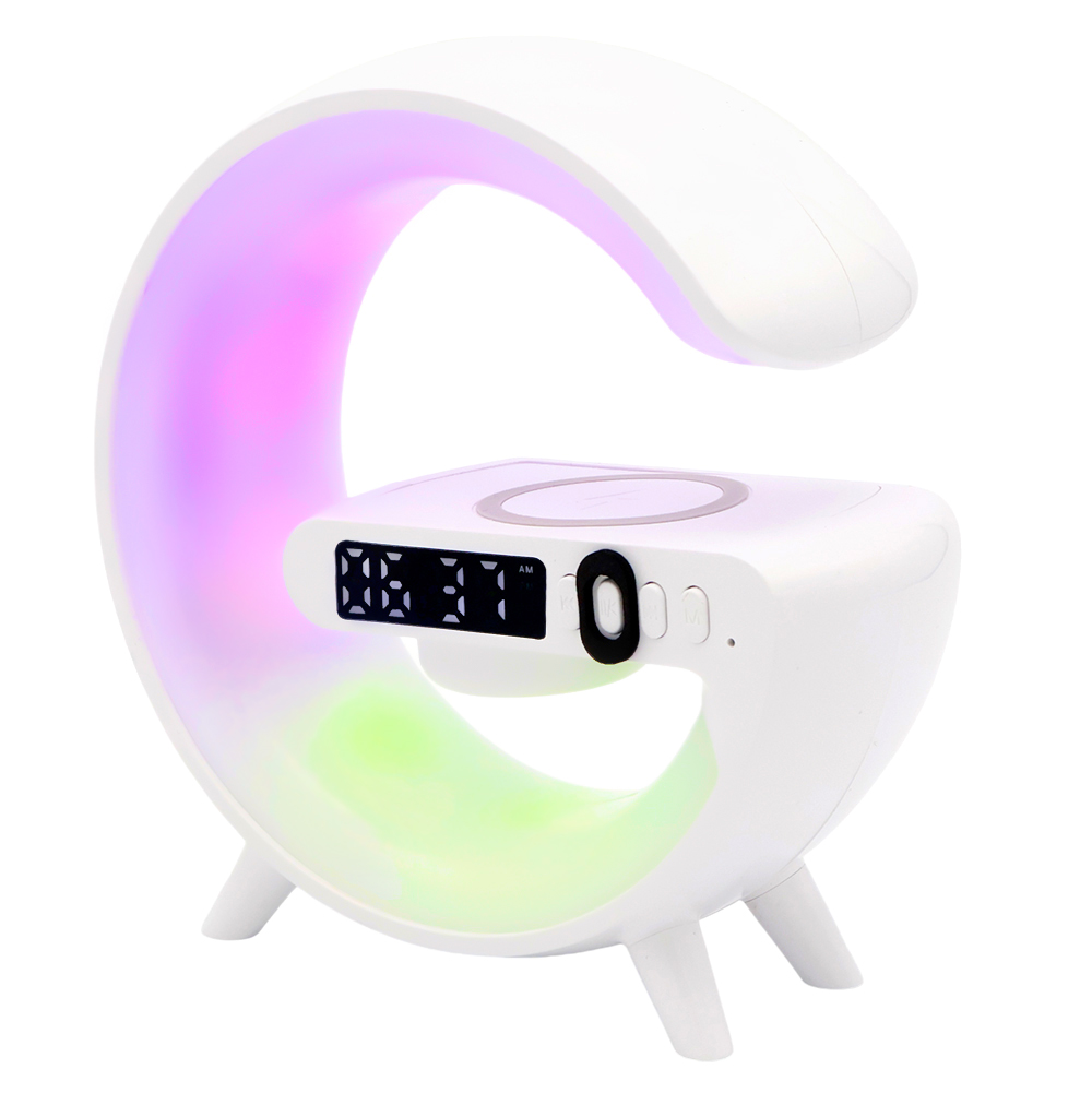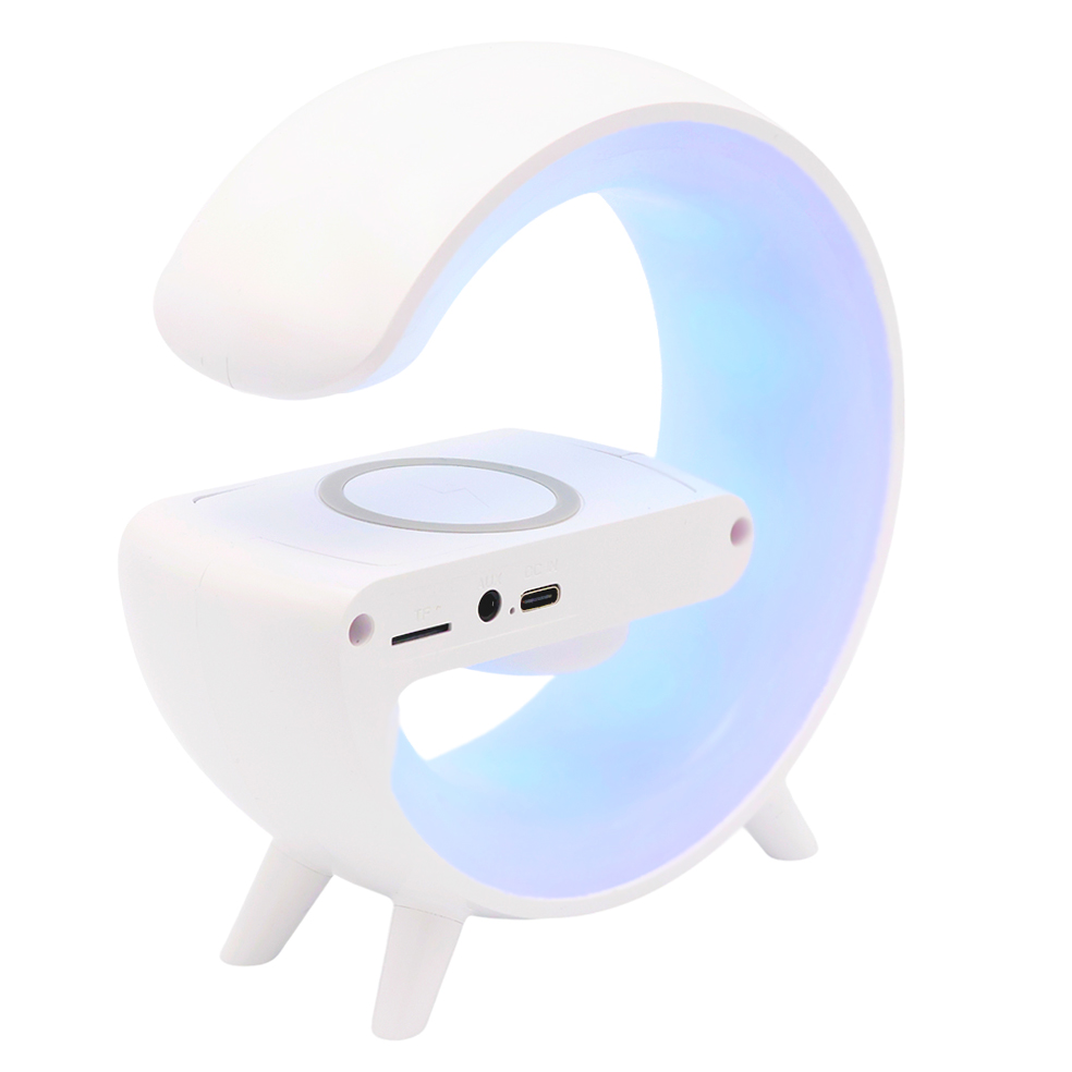 Беспроводная колонка с функцией беспроводной зарядки. Часы, будильник, RGB-подсветка, а так же защитная накладка на кнопке включения являются её особенностями. При остаточном заряде 10-20% подаётся предупреждающий сигнал. Размер: 155*55*160мм Bluetooth: v 5.2 Мощность динамика: 3W Батарея: 3.7V / 300 mAh Время работы: 2-3 Часа Время зарядки: 2,5 Часа Порт зарядки: Type-C Входное напряжение и ток: 5V/2A Беспроводное зарядное выход: 5W. Поддерживает все Android/Ios устройства с функцией беспроводной зарядки. Для работы беспроводной зарядки необходимо подключать устройство к сети через адаптер.- Виды нанесений: УФ-печать А3, УФ - DTF