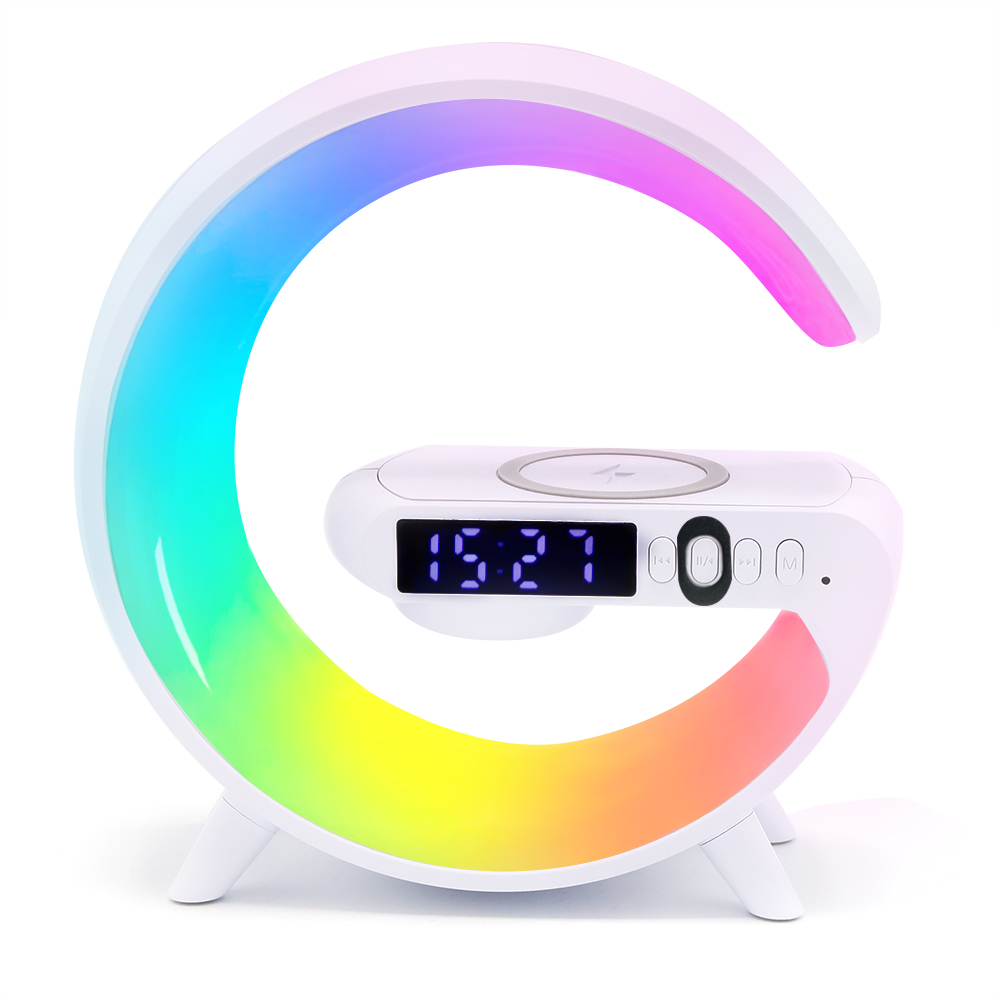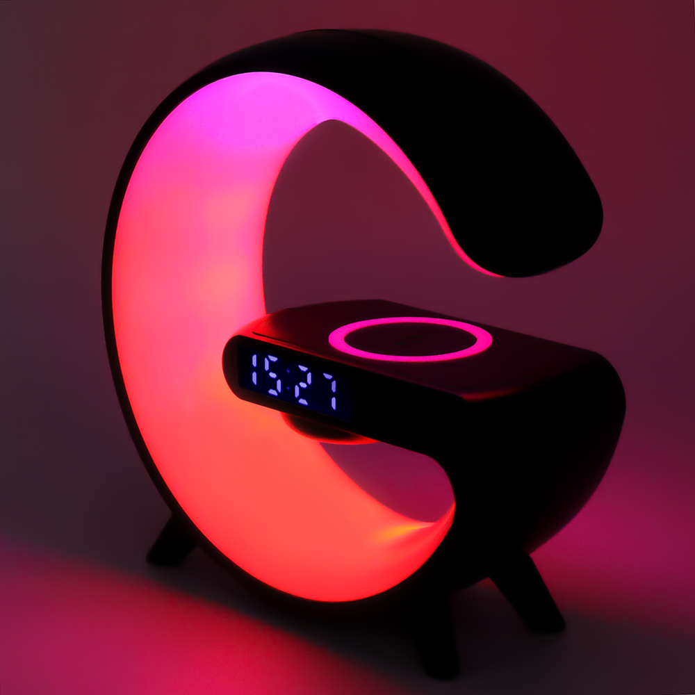 Беспроводная колонка с функцией беспроводной зарядки. Часы, будильник, RGB-подсветка, а так же защитная накладка на кнопке включения являются её особенностями. При остаточном заряде 10-20% подаётся предупреждающий сигнал. Размер: 155*55*160мм Bluetooth: v 5.2 Мощность динамика: 3W Батарея: 3.7V / 300 mAh Время работы: 2-3 Часа Время зарядки: 2,5 Часа Порт зарядки: Type-C Входное напряжение и ток: 5V/2A Беспроводное зарядное выход: 5W. Поддерживает все Android/Ios устройства с функцией беспроводной зарядки. Для работы беспроводной зарядки необходимо подключать устройство к сети через адаптер.- Виды нанесений: УФ-печать А3, УФ - DTF