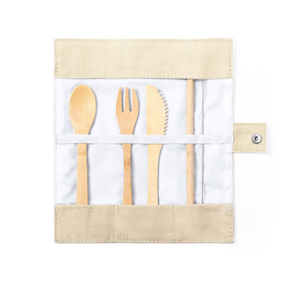 Набор из пяти предметов: ложка, вилка, нож, трубочка для питья с ершиком для чистки. Предметы убраны в холщовый чехол на кнопке и внутри закреплены резинкой. Такой набор удобно носить с собой, брать в дорогу или путешествие. Индивидуальная упаковка - ПЭ пакет -