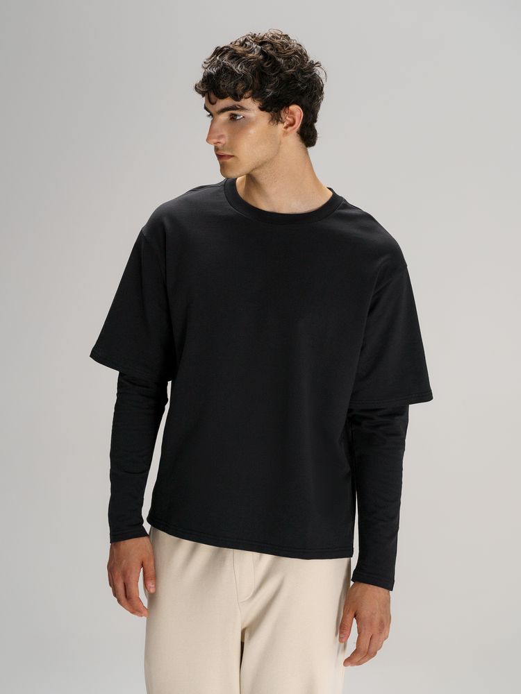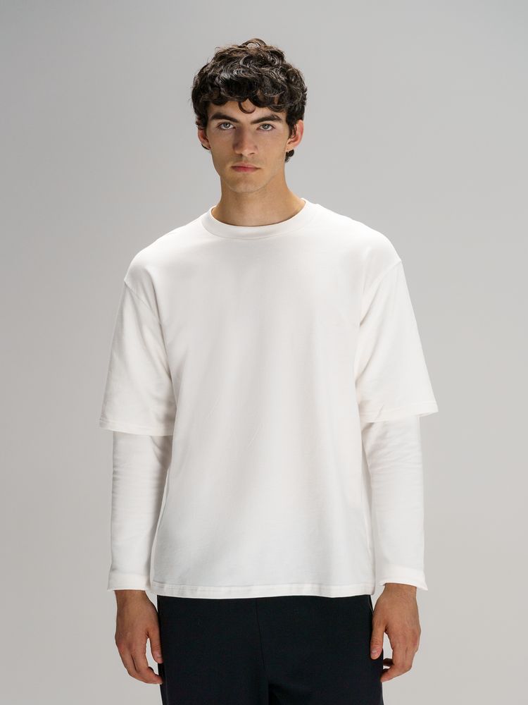 Футболка оверсайз в трендовом исполнении double sleeve (с двойным рукавом) — отличный вариант для создания повседневного образа. Легкая дышащая хлопковая ткань с гладкой трикотажной фактурой приятна к телу, а расслабленный оверсайз силуэт делает футболку Kosmos идеальной для любых жизненных маневров.