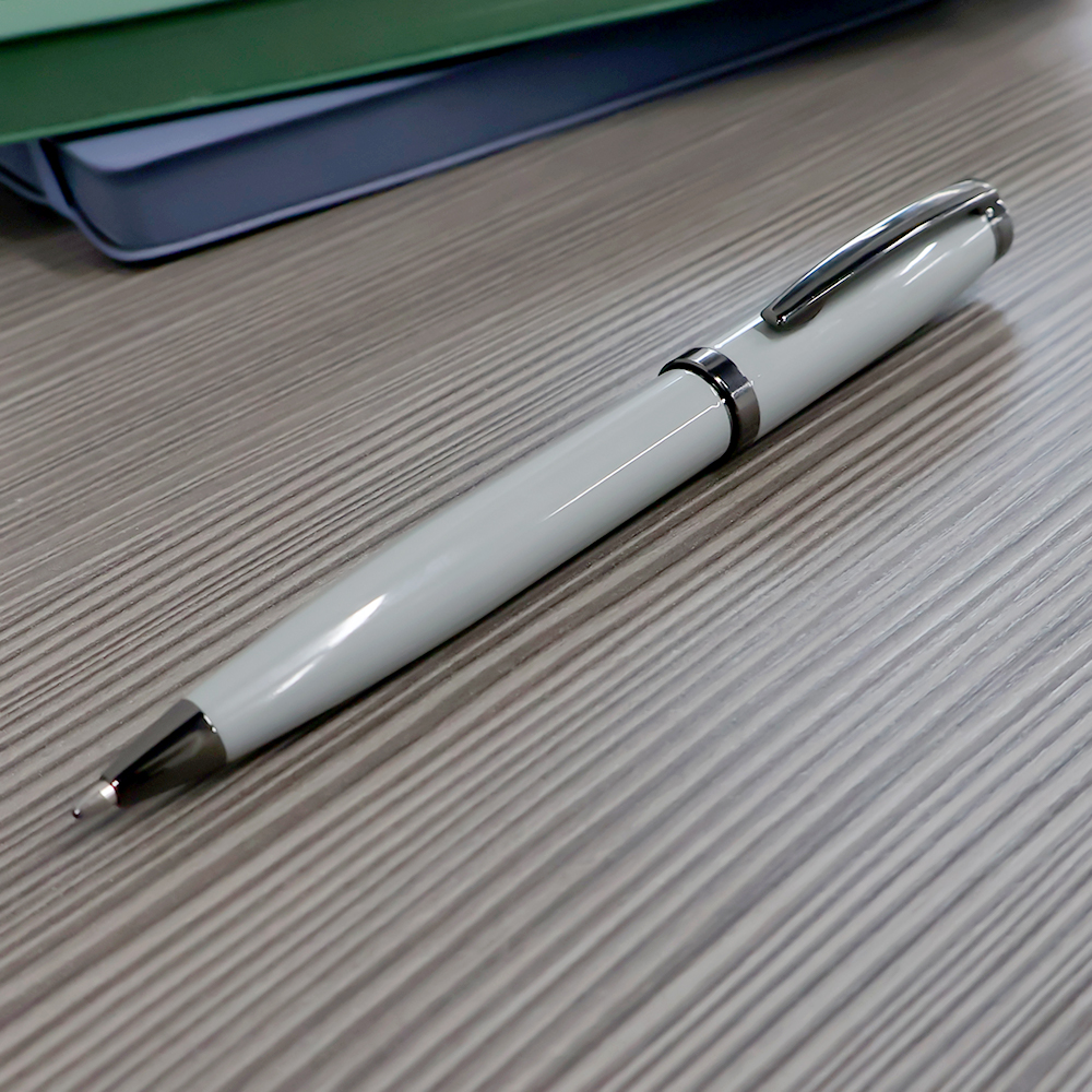 Наша Бетти — подарок для любителей более увесистых и солидных форм. Общий вес ручки — 33 грамма! У нашей красотки поворотный механизм, покрытый глянцем корпус из нержавеющей стали, стержень Паркер 0,7 мм с синими чернилами. Элементы ручки: клип, кольцо и дюбка покрыты ган-метал краской. Ручку приятно держать в руке и демонстрировать публике.- Виды нанесений: Гравировка-А1 (оптоволоконный лазер), УФ-печать