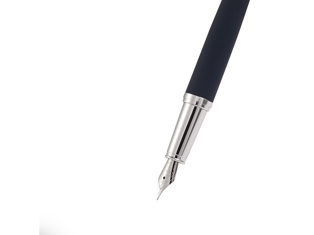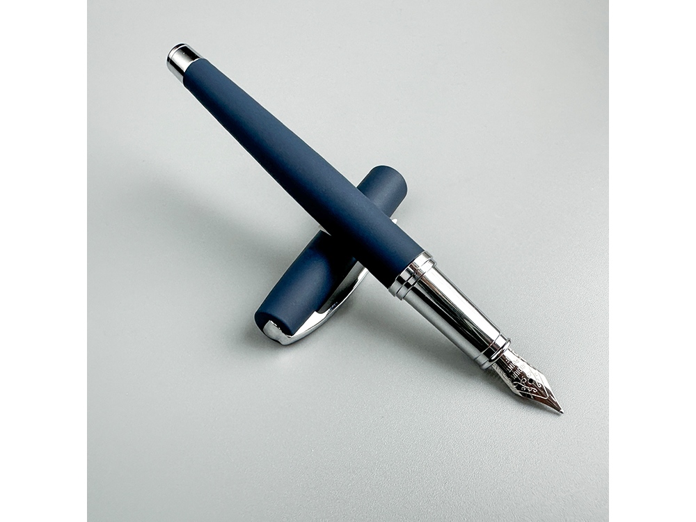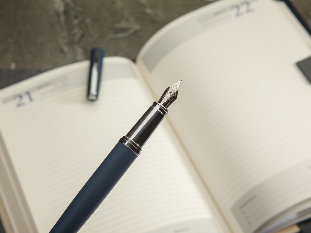 Cтильная перьевая ручка Sienna от Bruno Visconti синего цвета с контрастирующими элементами в цвет серебра.  Благодаря покрытию Soft Touch пальцы не скользят по корпусу ручки, письмо комфортное и легкое. Ручка оснащена высококачественным механизмом подачи чернил, благодаря которому линия остается однородной и аккуратной. Чернила не токсичны, на основе водорастворимого красителя, не забивают фидер. Перьевой наконечник выполнен из иридиума и дополнен орнаментом.