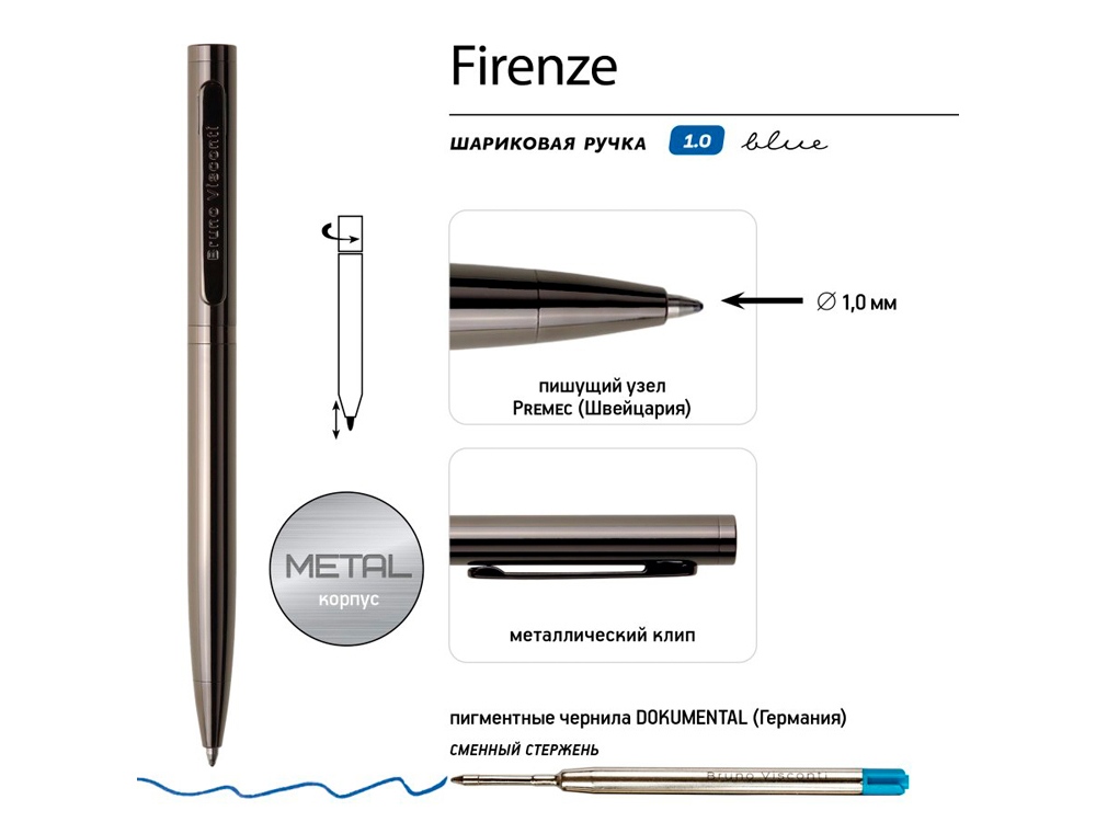 Ручка автоматическая, с легким поворотным механизмом подачи стержня. Надежный пишущий узел d 1,0 мм (от швейцарского производителя Premec) гарантирует высокое качество так же, как и пигментные чернила Dokumental (Германия). Благодаря им писать ручкой Firenze одно удовольствие – она мягко скользит по поверхности бумаги, оставляя ровную, четкую линию.
