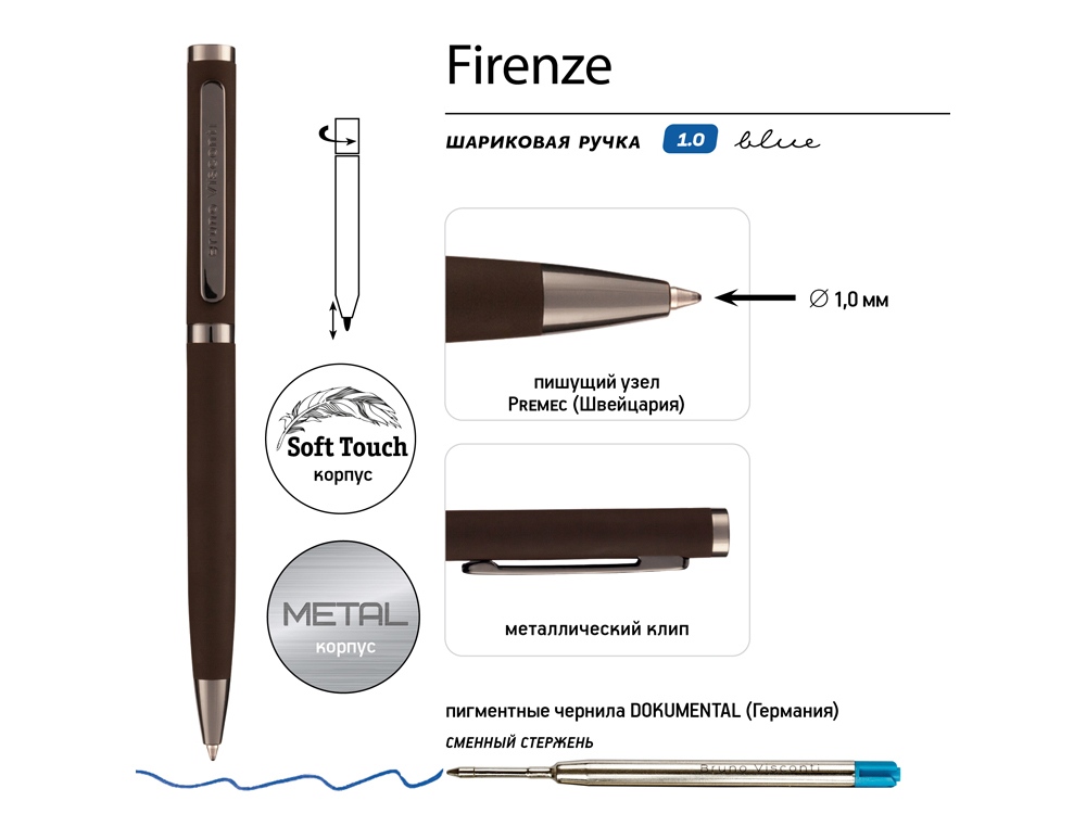 Ручка автоматическая, с легким поворотным механизмом подачи стержня. Надежный пишущий узел d 1,0 мм (от швейцарского производителя Premec) гарантирует высокое качество также, как и пигментные чернила Dokumental (Германия). Благодаря им писать ручкой Firenze одно удовольствие – она мягко скользит по поверхности бумаги, оставляя ровную, четкую линию. -