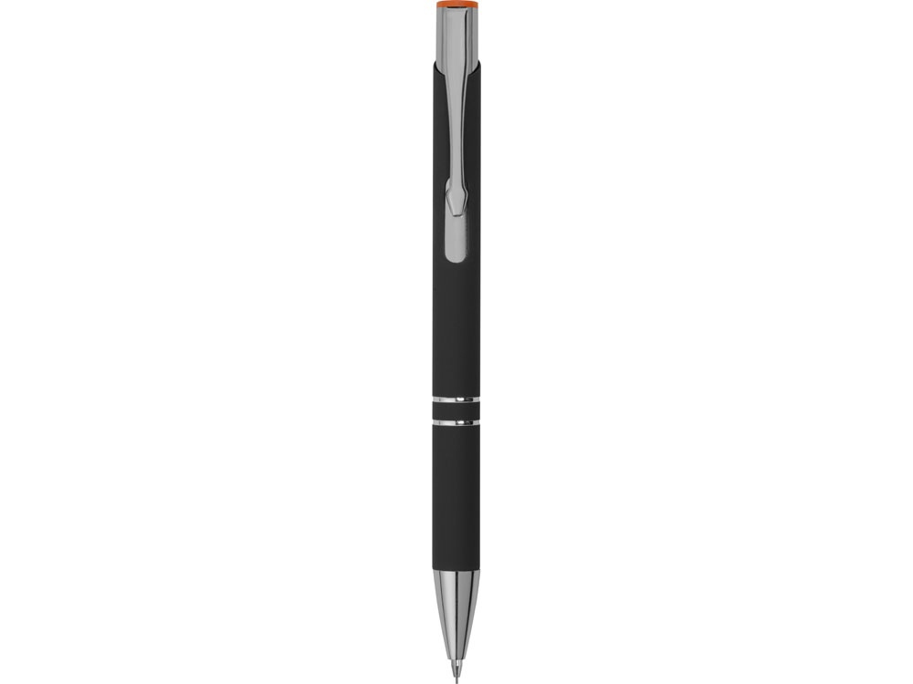 Черная шариковая ручка с кнопочным механизмом и тактильно приятным покрытием софт-тач. Цветная гравировка соответствует цвету кнопки и делает ее еще более изысканным подарком. -